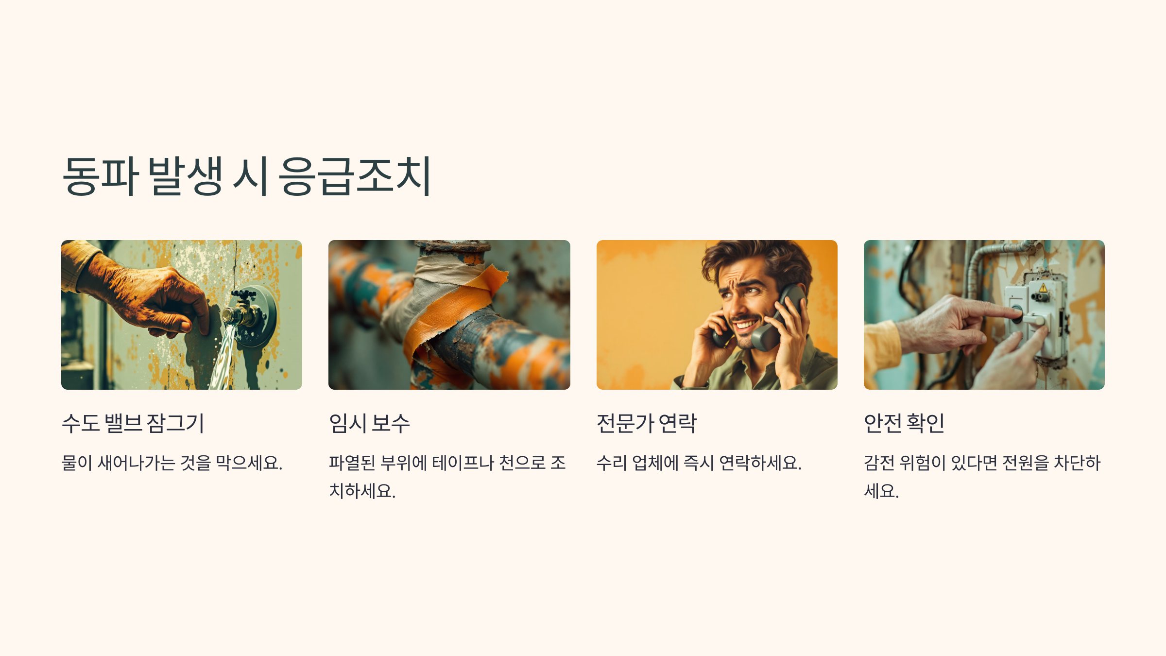 동파가 발생하면 신속하게 대처해야 피해를 최소화할 수 있습니다.