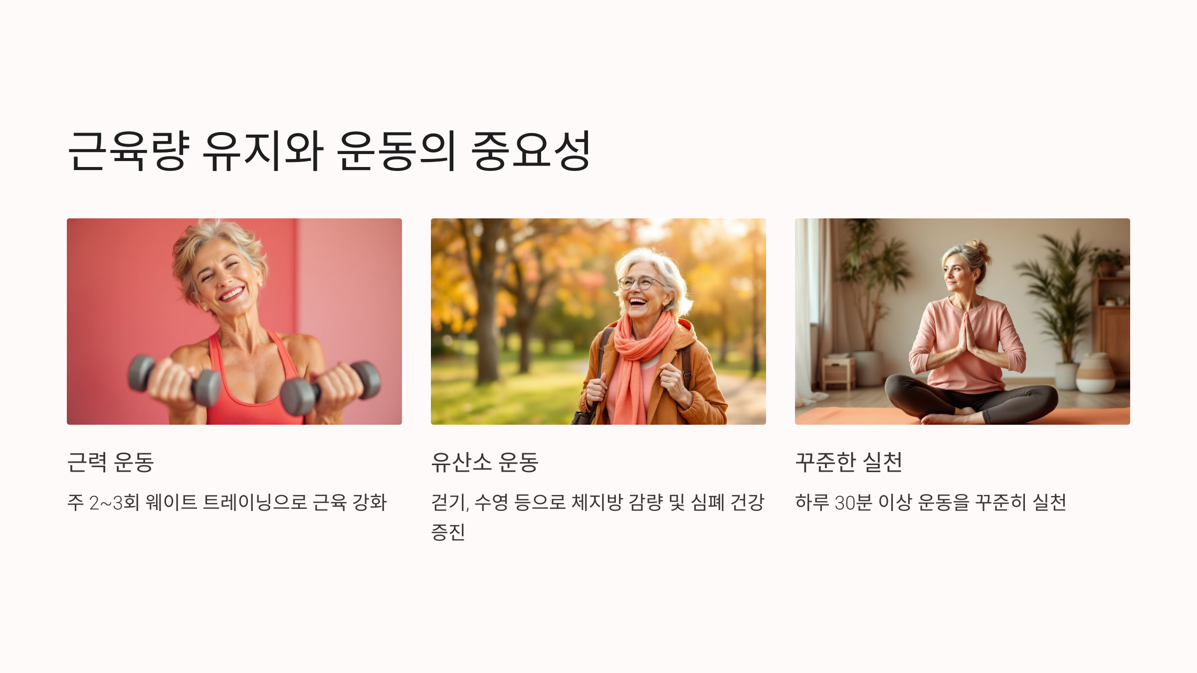 근육량이 자연스럽게 감소하면서 기초 대사량도 낮아집니다. 따라서 근육 유지가 매우 중요합니다.