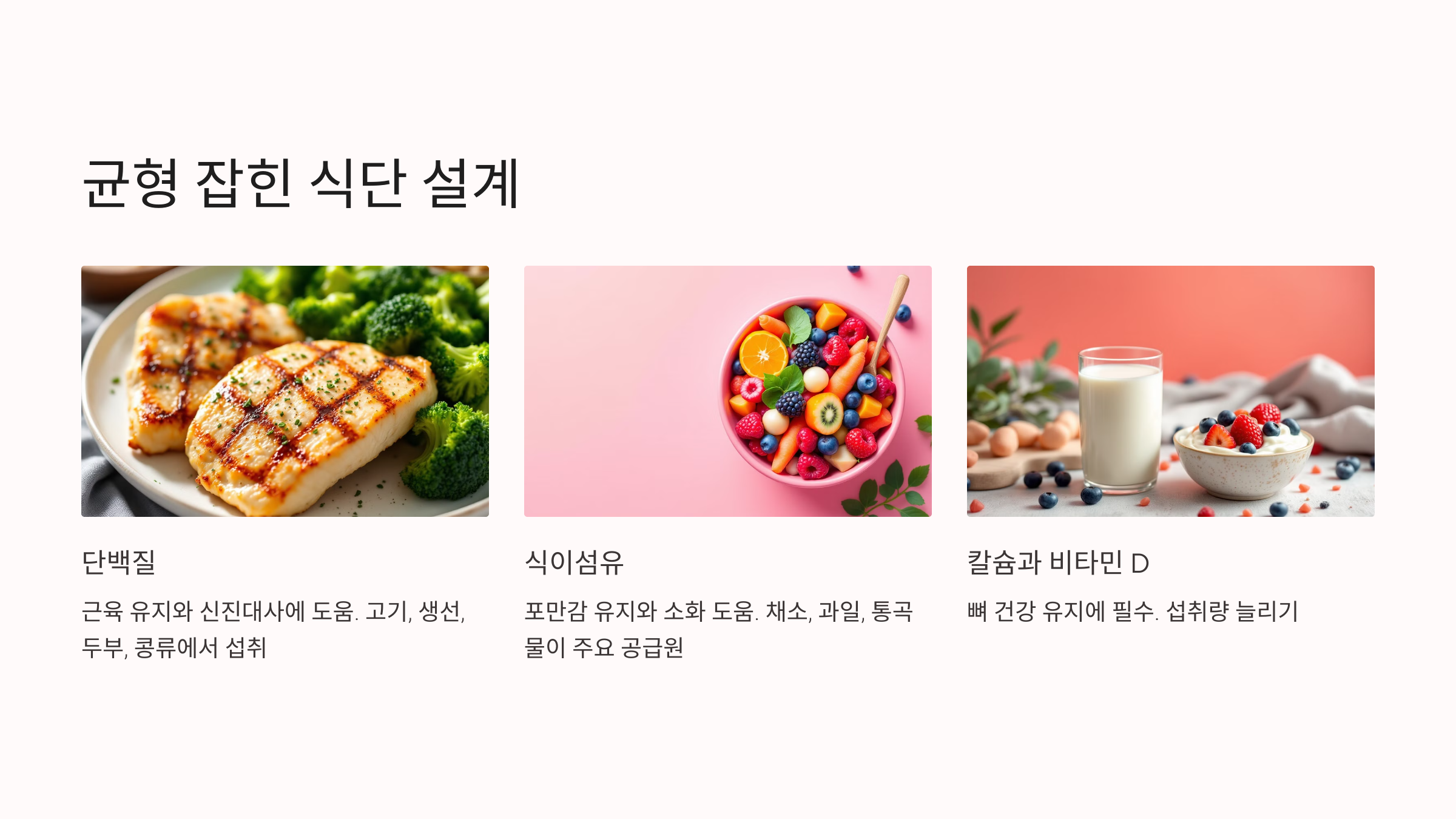 칼슘과 비타민 D 섭취를 늘려 뼈 건강을 유지하세요.