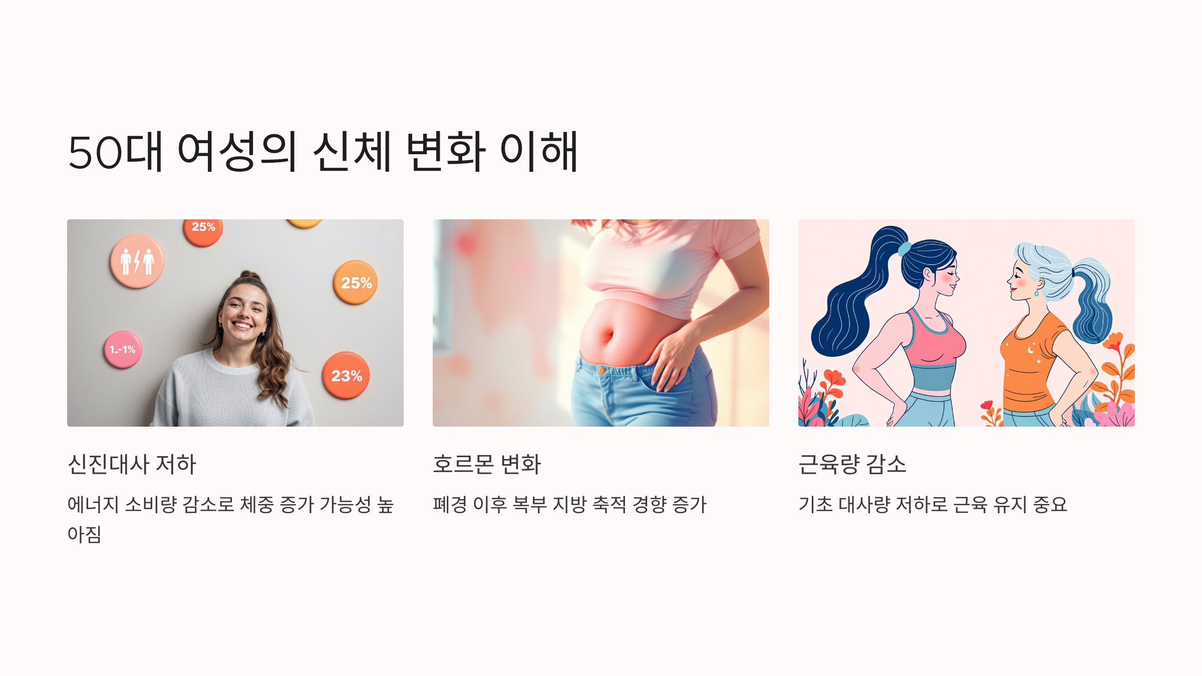 50대 여성의 다이어트는 단순히 체중 감량이 아니라 건강 유지와 삶의 질 향상을 목표로 해야 합니다. 이 나이대에는 신진대사가 느려지고, 근육량 감소와 호르몬 변화로 인해 체중 관리가 더욱 어려워질 수 있습니다. 하지만 올바른 접근법과 꾸준한 실천으로 성공적인 다이어트를 이룰 수 있습니다.