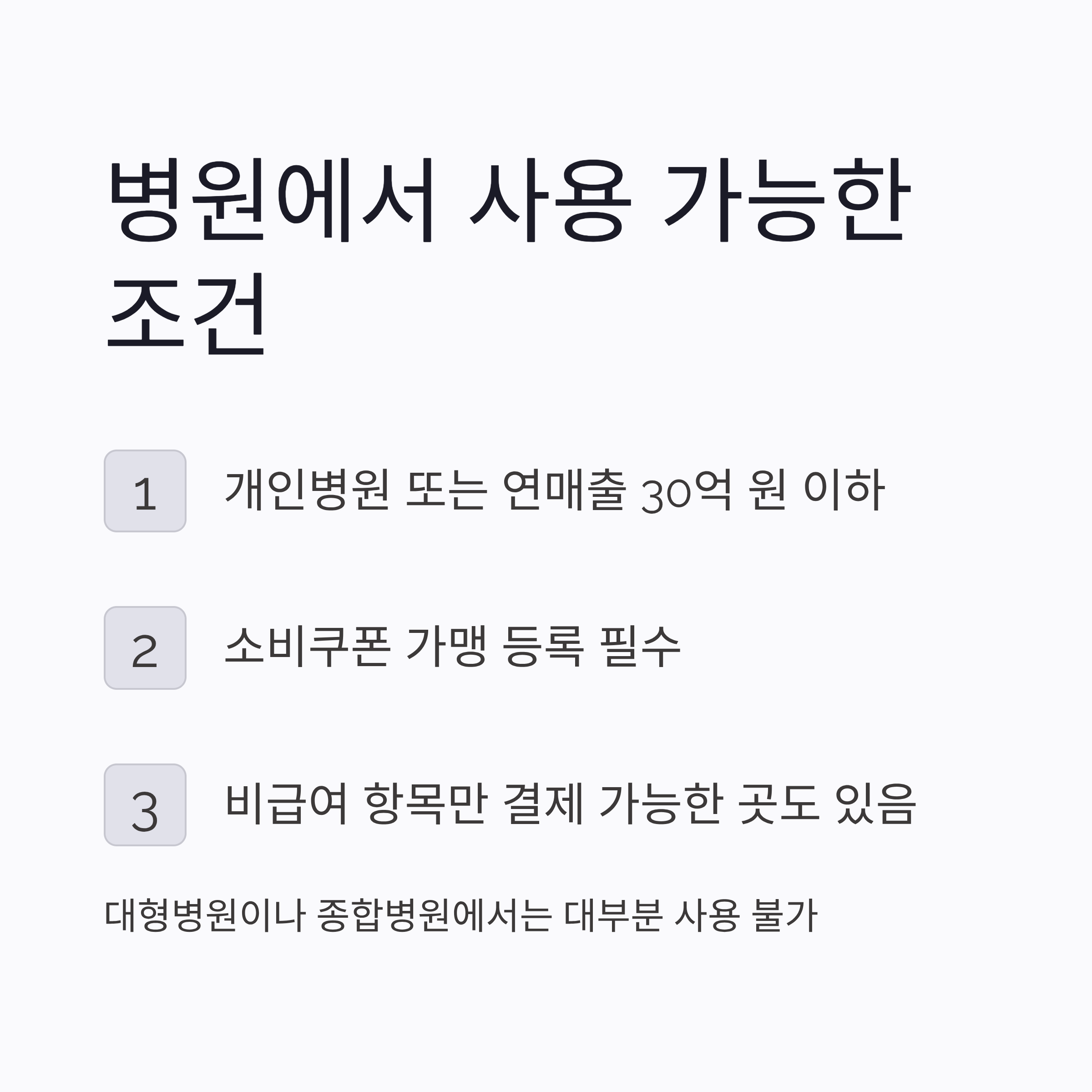 병원은 원칙적으로 '의료기관'으로 분류돼요. 이 경우 다음 조건이 충족되지 않으면 소비쿠폰 사용이 제한돼요: