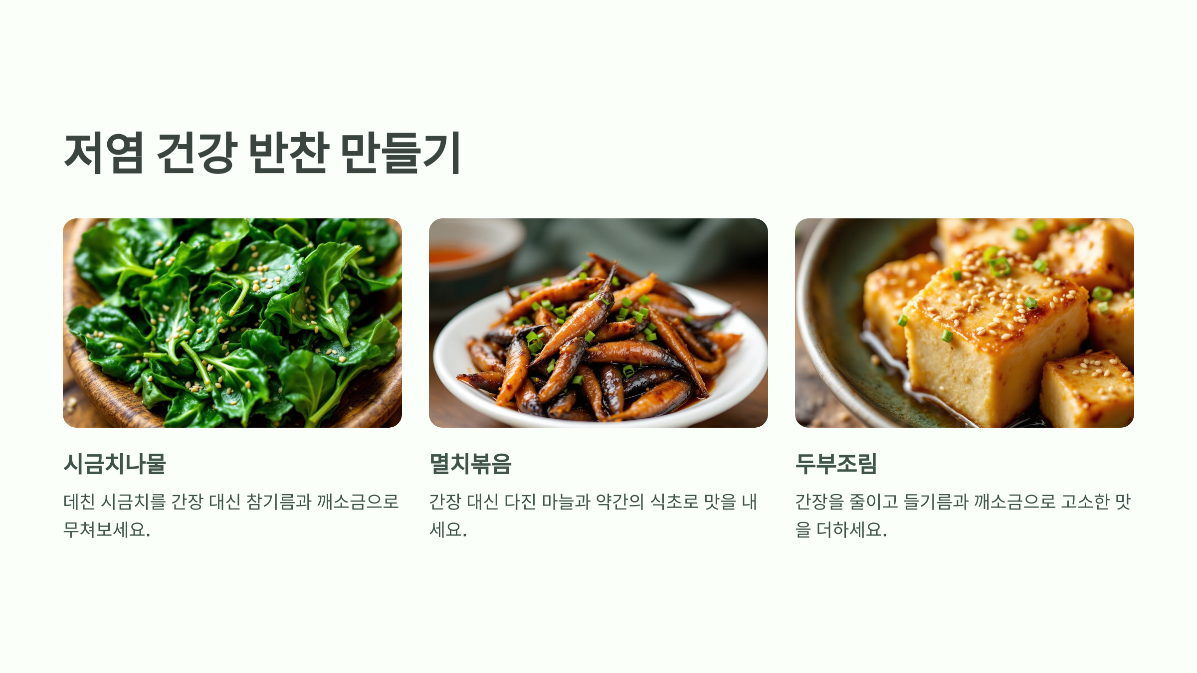 저염 반찬은 나트륨 섭취를 줄이면서도 한국인의 밥상에 맞는 맛있는 조리법으로 가능합니다.