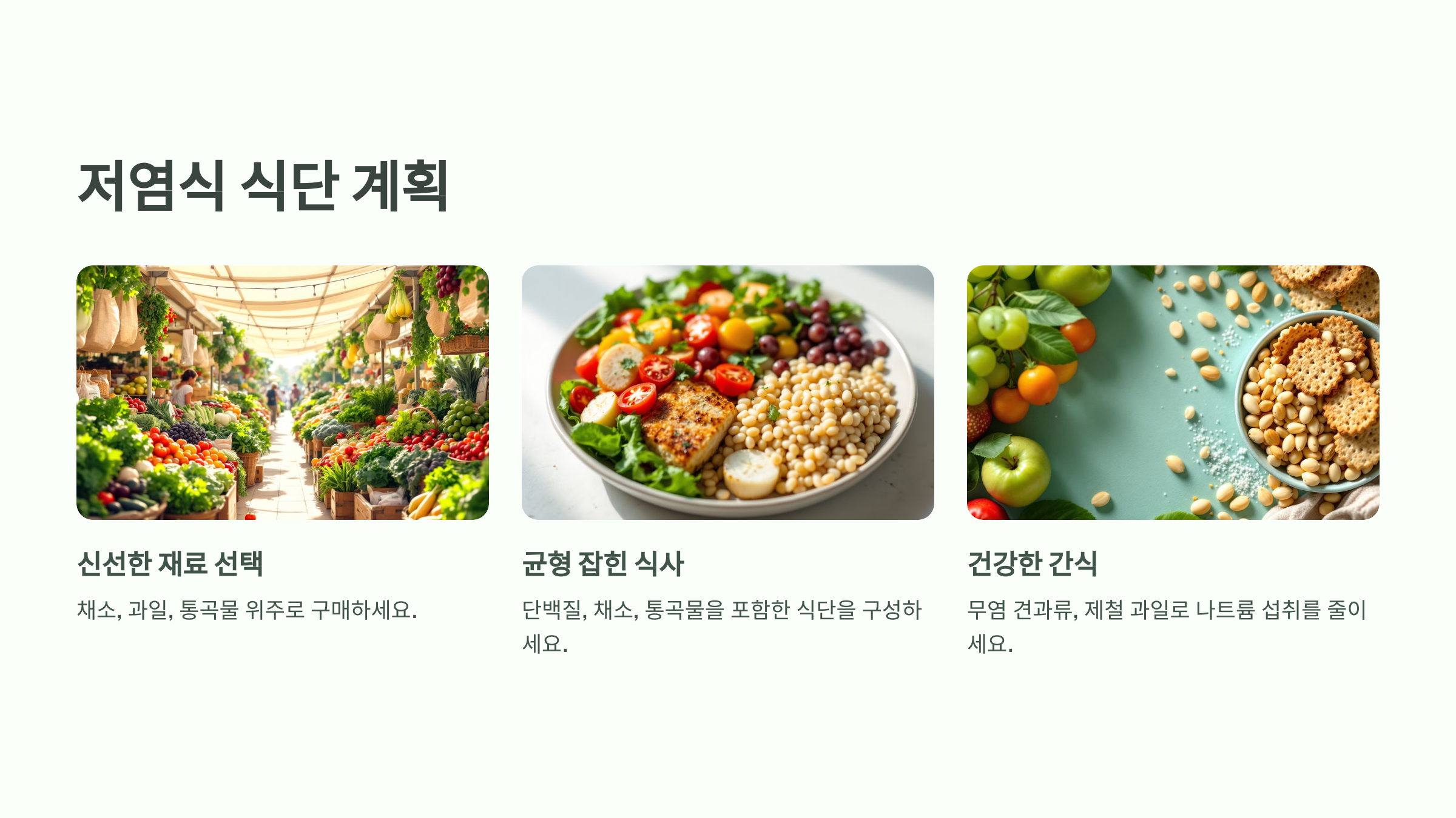 간식으로는 무염 견과류, 제철 과일, 당근 스틱 등을 선택해 나트륨 섭취를 최소화하세요.