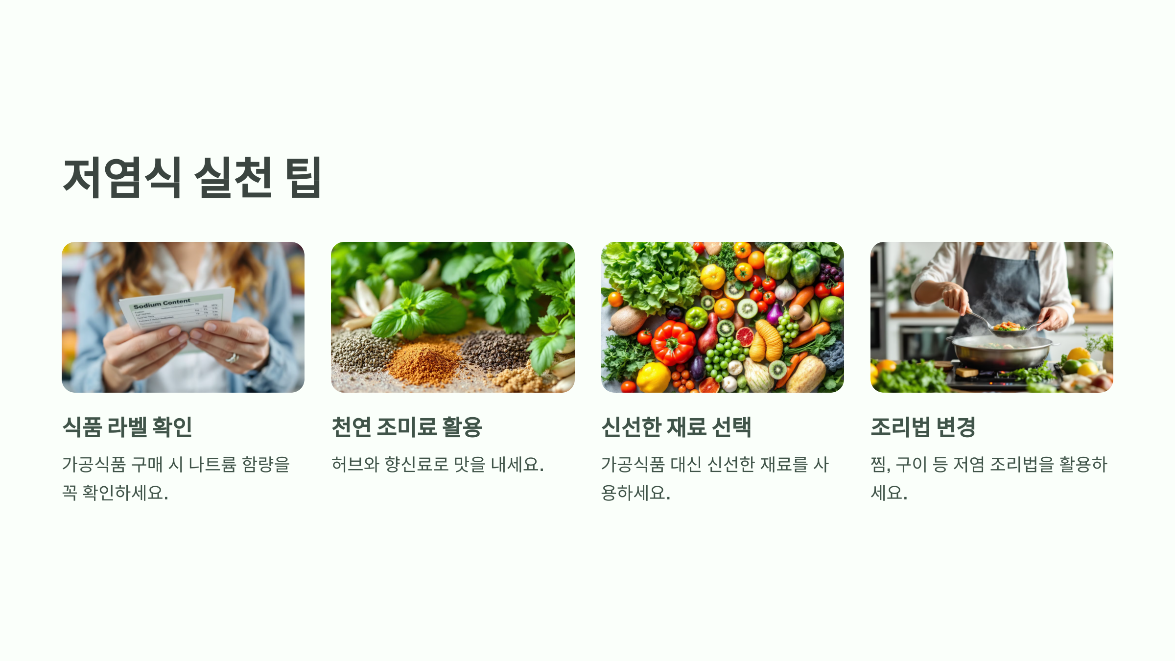 나트륨 섭취를 줄이기 위해 조리 과정에서 소금 사용을 최소화하는 것이 중요합니다.