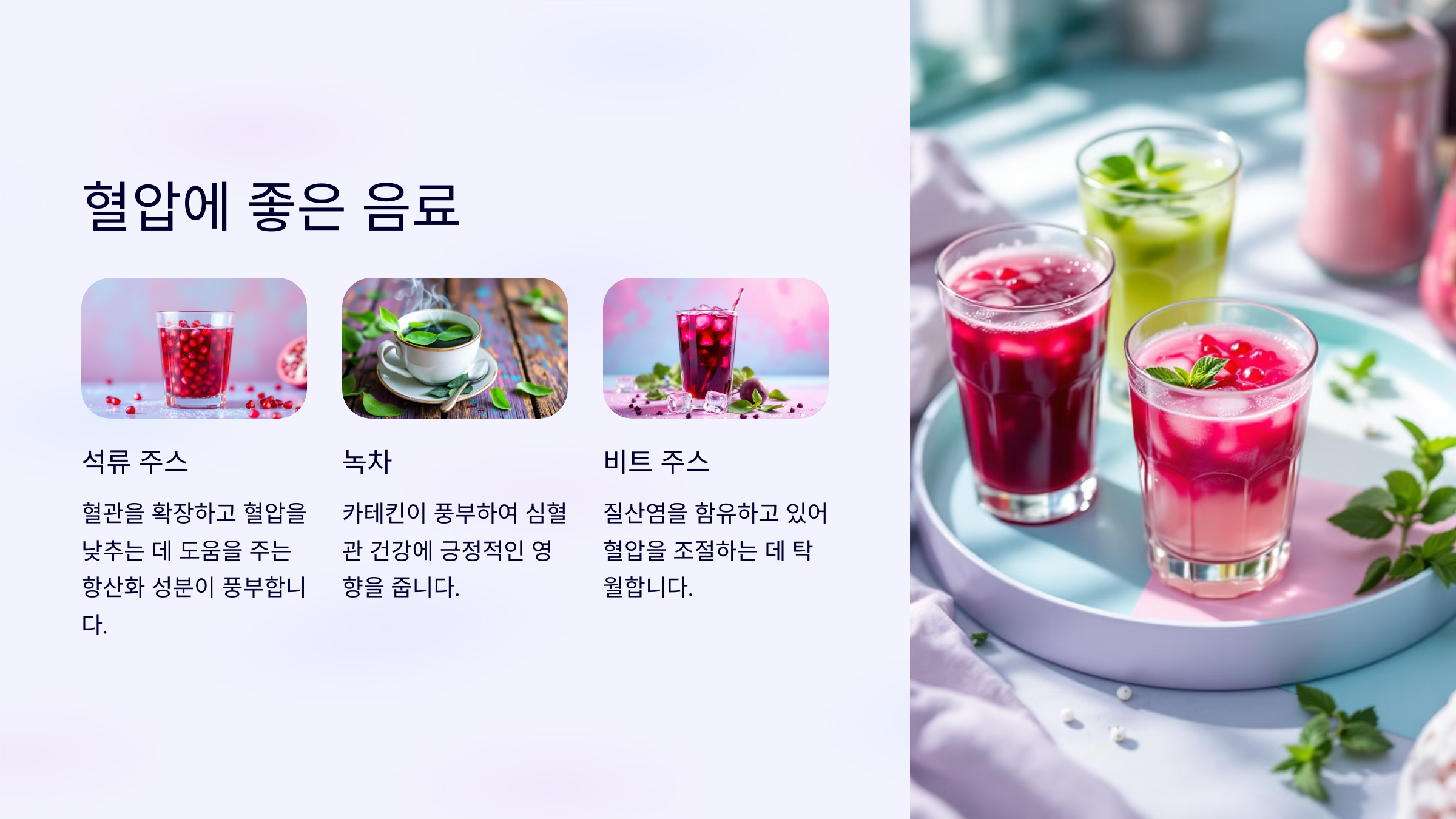 석류 주스, 녹차, 코코넛 워터, 허브차 등은 혈압 조절에 도움을 주는 음료입니다.