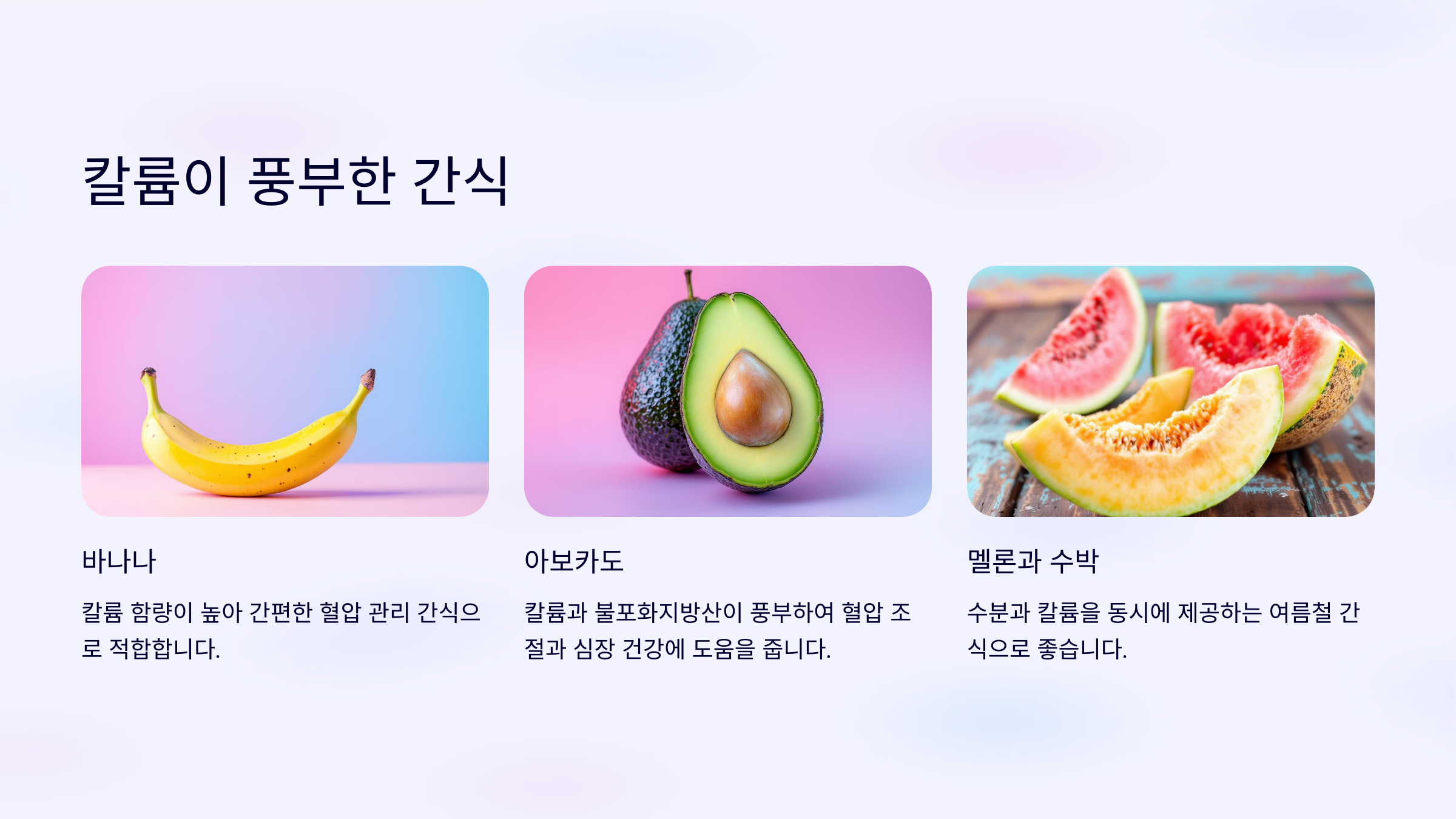 칼륨은 나트륨 배출을 도와 혈압을 낮추는 데 도움을 주는 중요한 영양소입니다. 칼륨이 풍부한 간식을 섭취하세요.