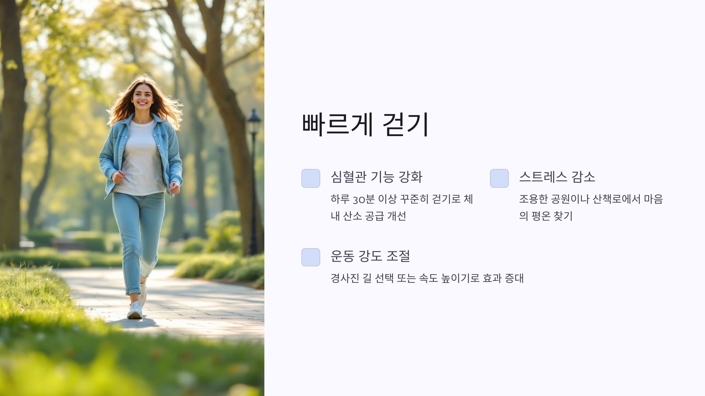 운동 강도를 높이고 싶다면 평지 대신 약간의 경사가 있는 길을 걷거나 속도를 높여보세요.