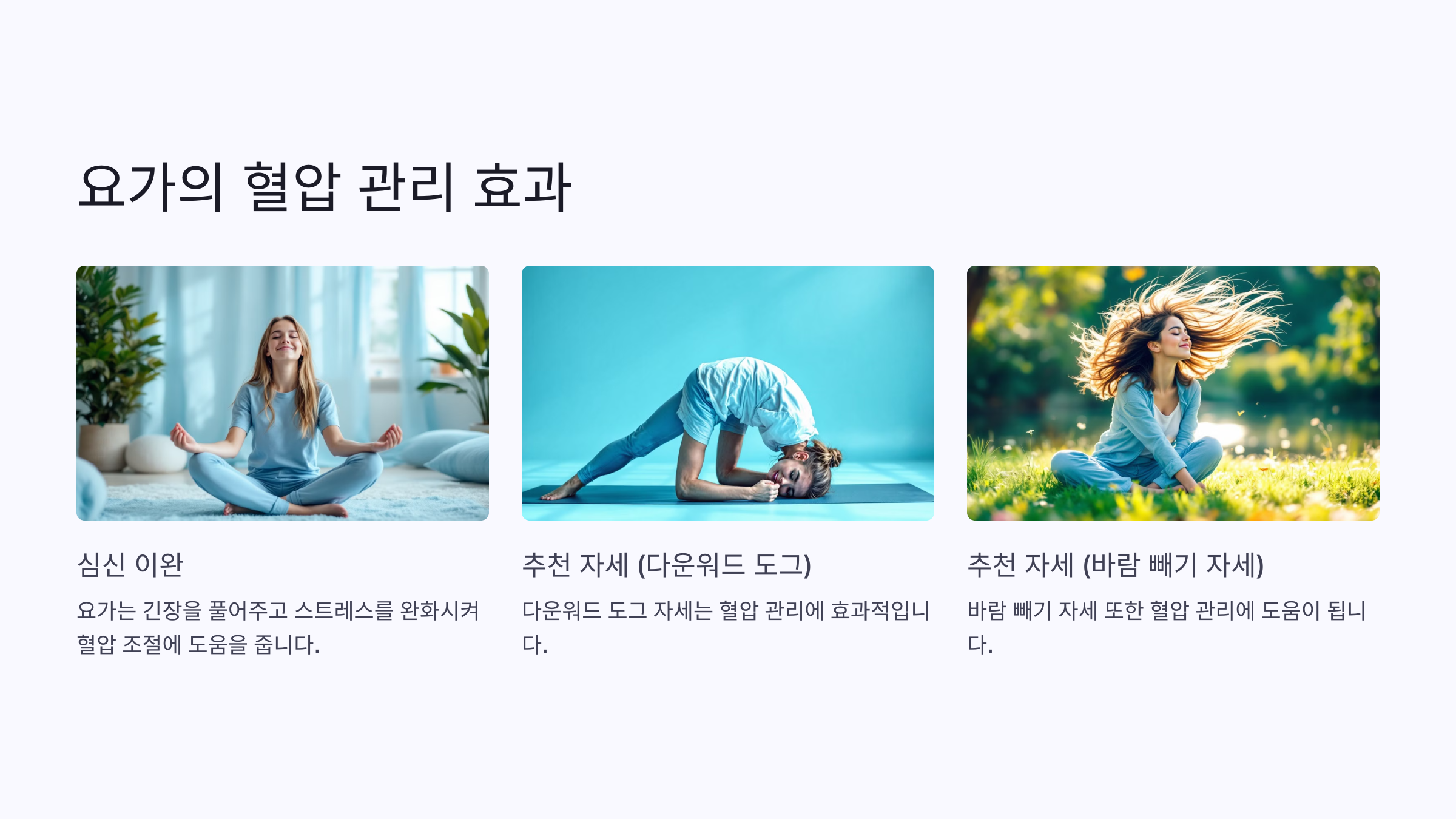 혈압 관리에 좋은 자세로는 차일드 포즈, 다운워드 도그, 그리고 바람 빼기 자세 등이 있습니다.