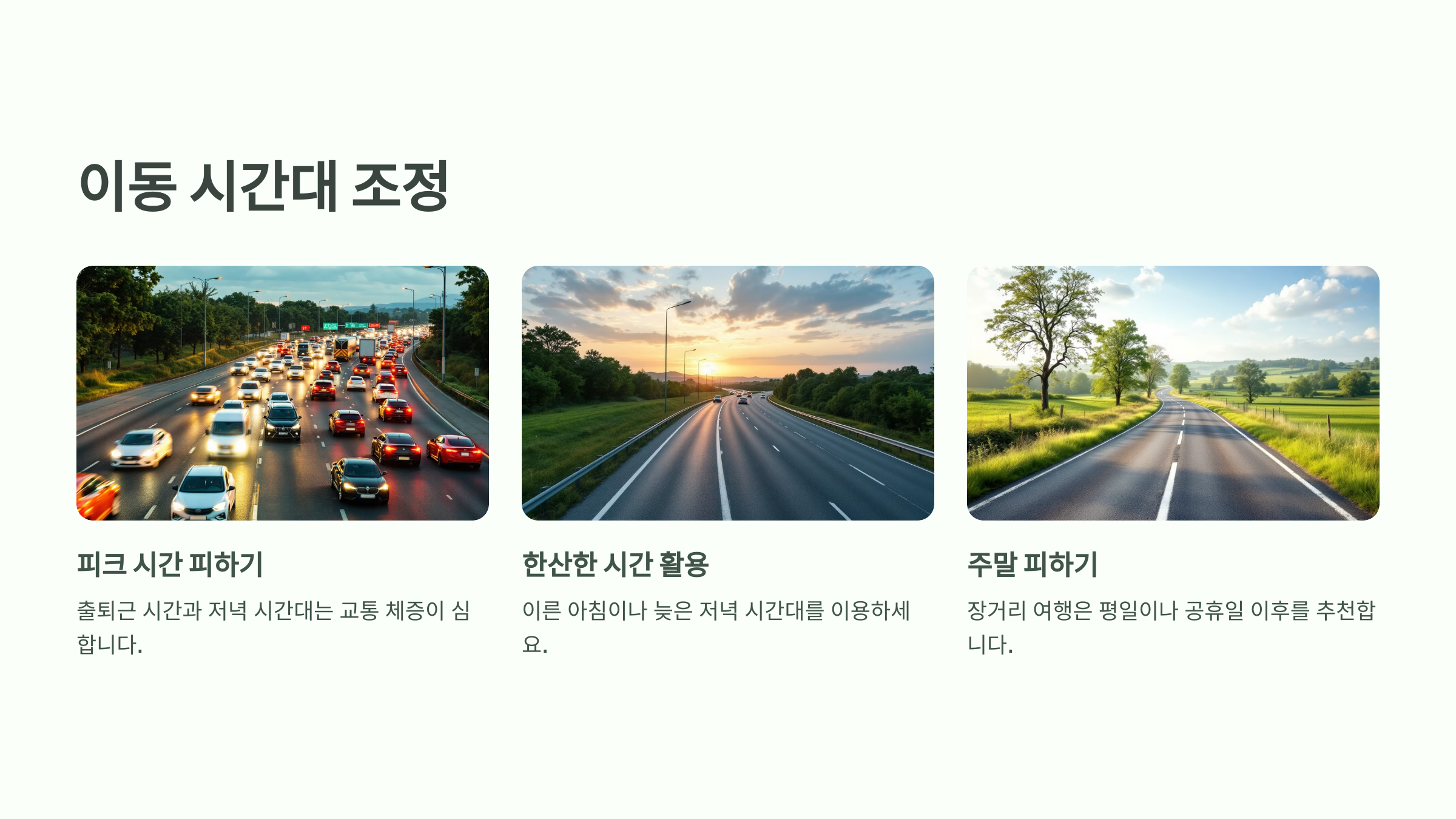 이른 아침이나 늦은 저녁 시간대를 활용하면 한산한 도로를 이용할 수 있습니다.