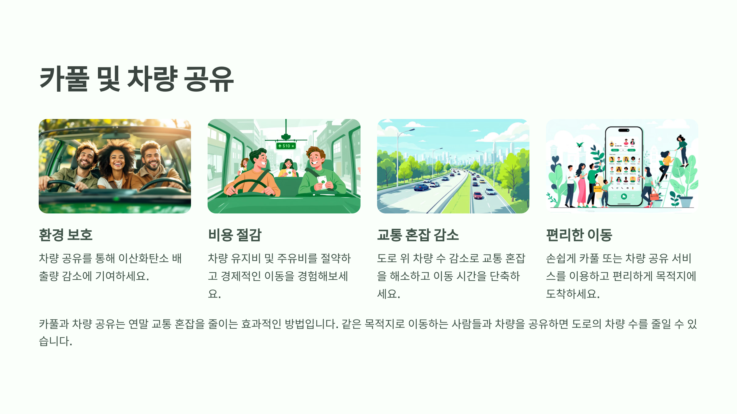 카풀은 환경 보호에도 기여하며, 연말 교통 문제를 완화하는 데 효과적입니다.