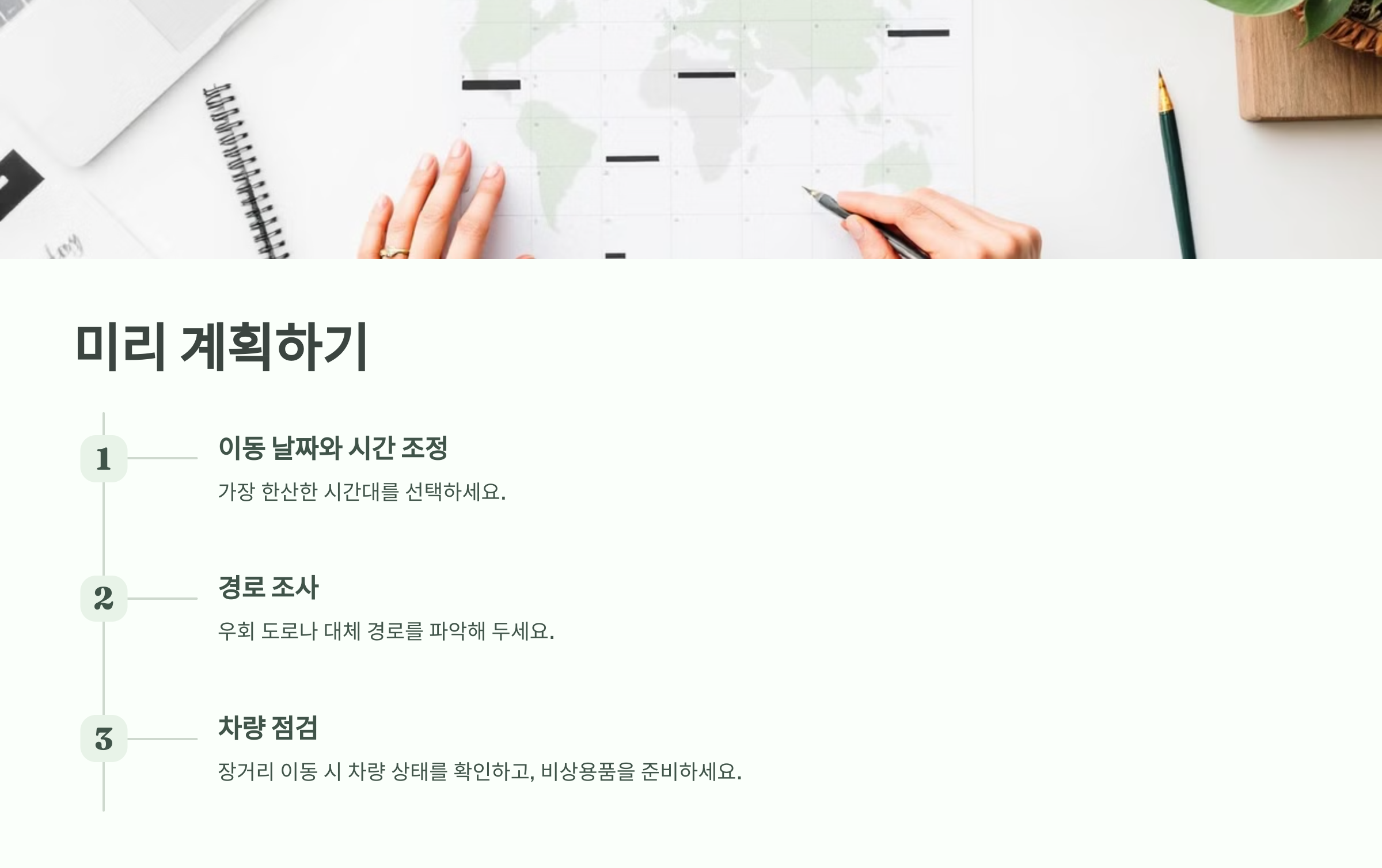 장거리 이동 시에는 차량 점검을 통해 차량 상태를 확인하고, 비상용품을 준비하세요.