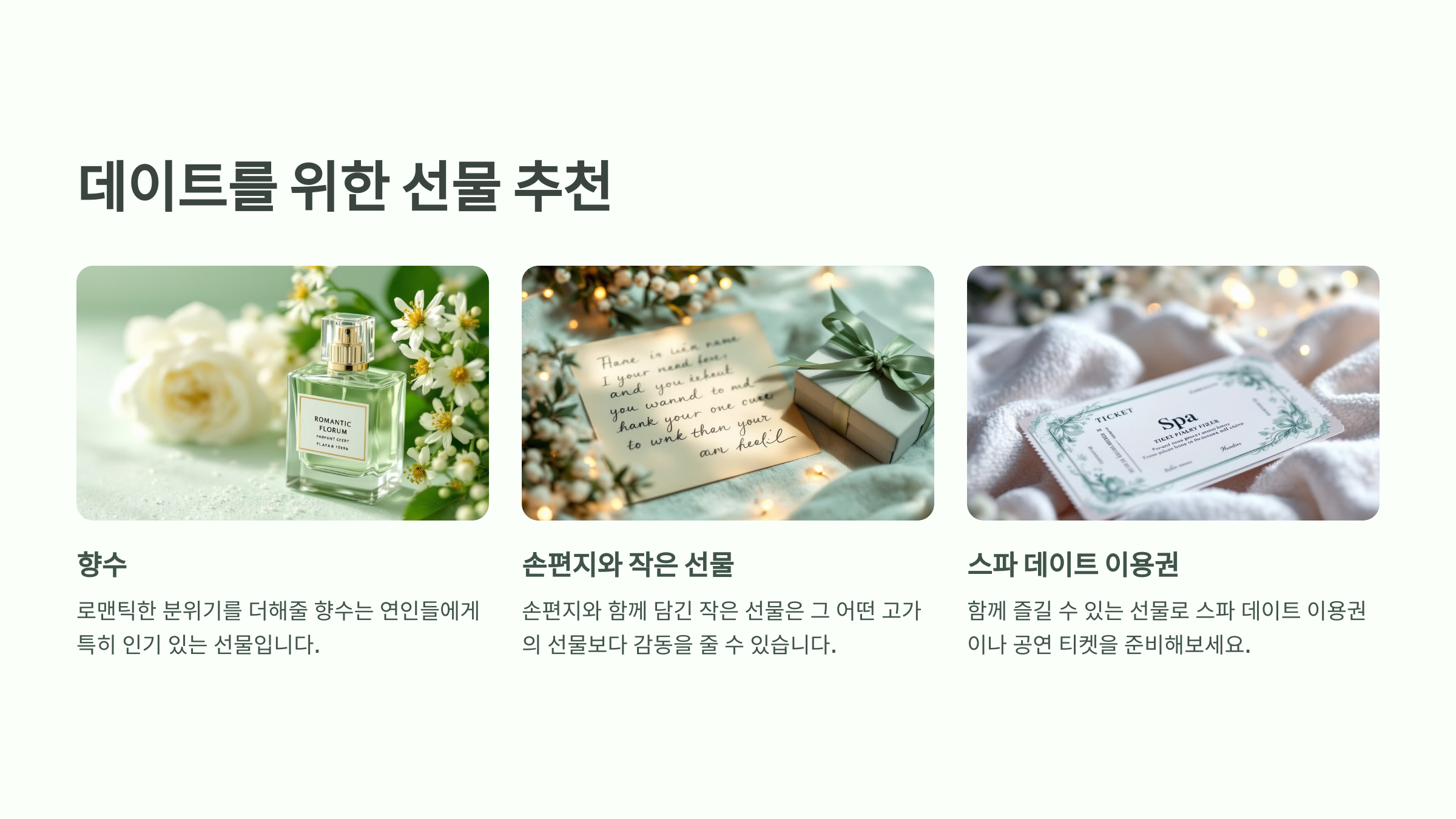 로맨틱한 분위기를 더해줄 향수나 맞춤 제작된 악세서리는 연인들에게 특히 인기 있는 선물입니다.