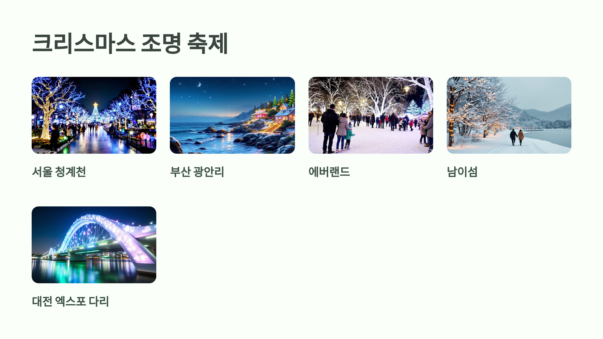 에버랜드나 롯데월드와 같은 테마파크는 크리스마스 시즌에 화려한 조명으로 꾸며져 특별한 분위기를 선사합니다.
