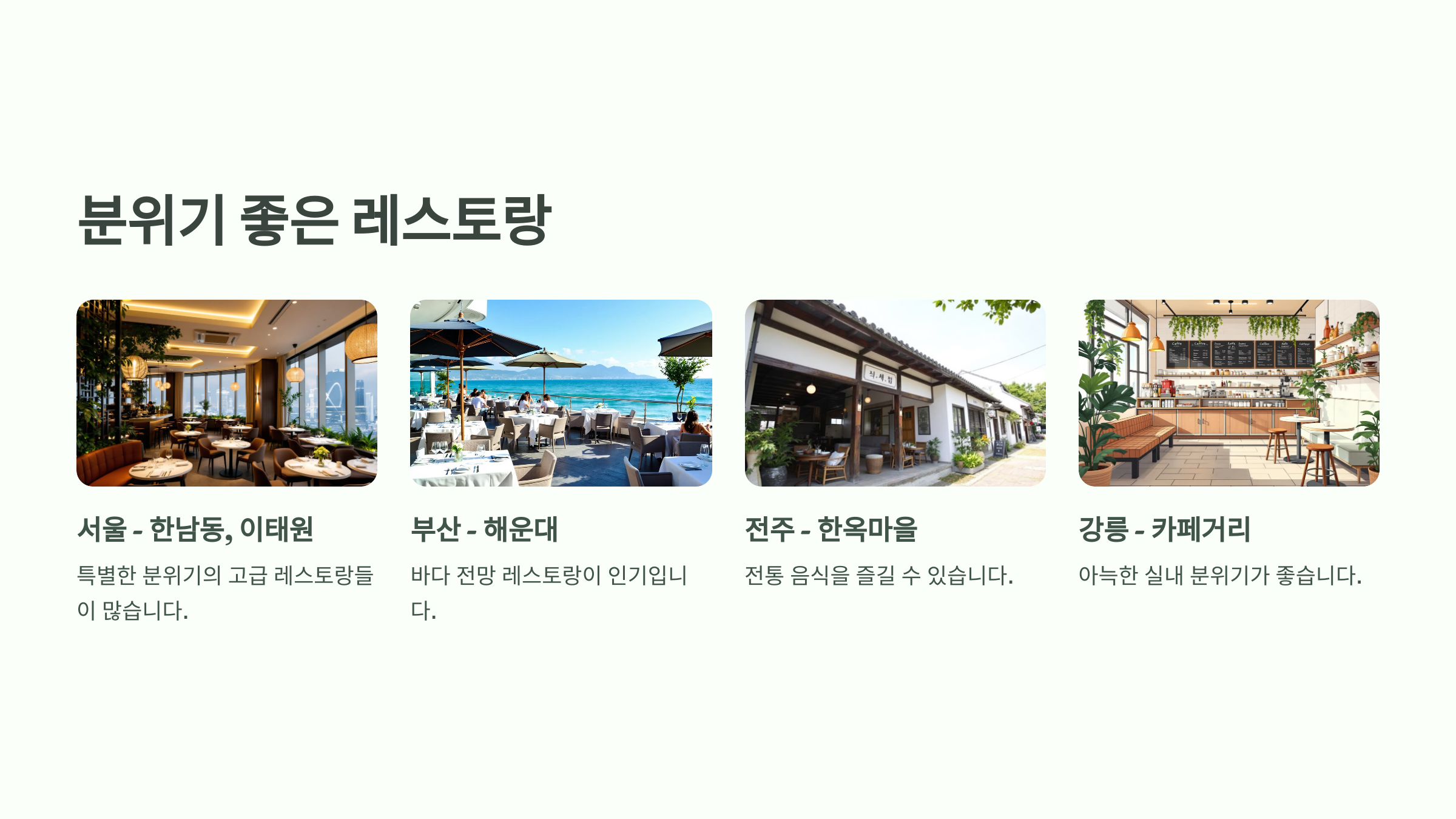 홍대와 강남 지역은 트렌디한 레스토랑과 아기자기한 카페가 많아 데이트 코스로 적합합니다.