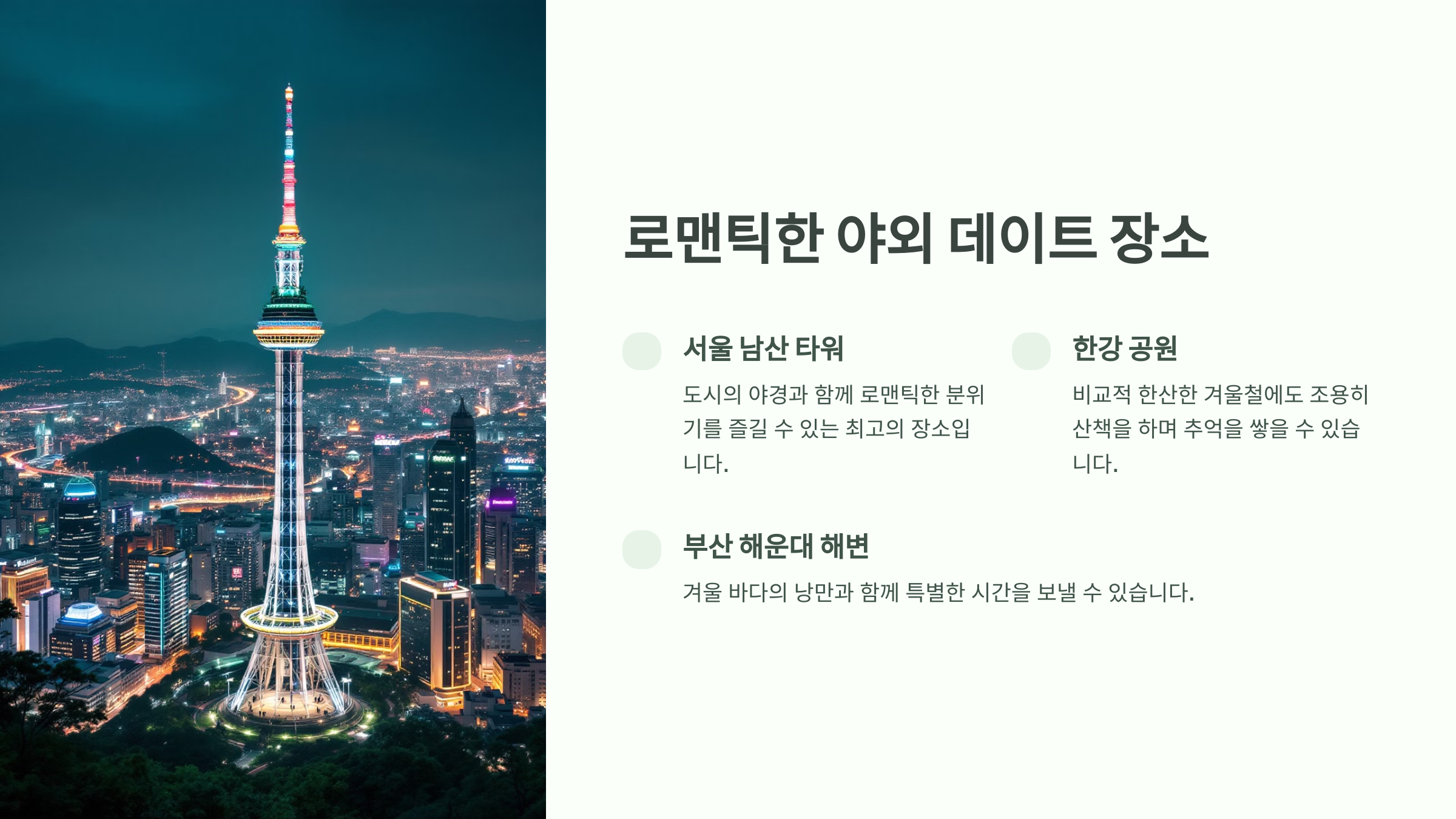 방한용품 외에도 이동 경로와 교통 상황을 미리 점검해 안전한 데이트를 준비하세요.
