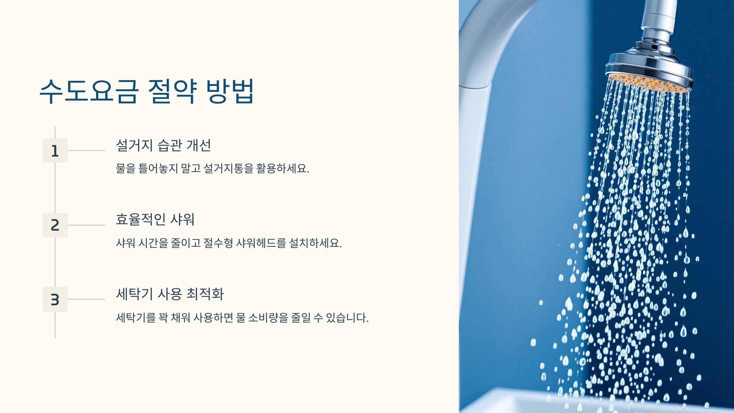 둘째, 샤워 시간을 줄이고 샤워헤드에 절수형 제품을 설치하세요.