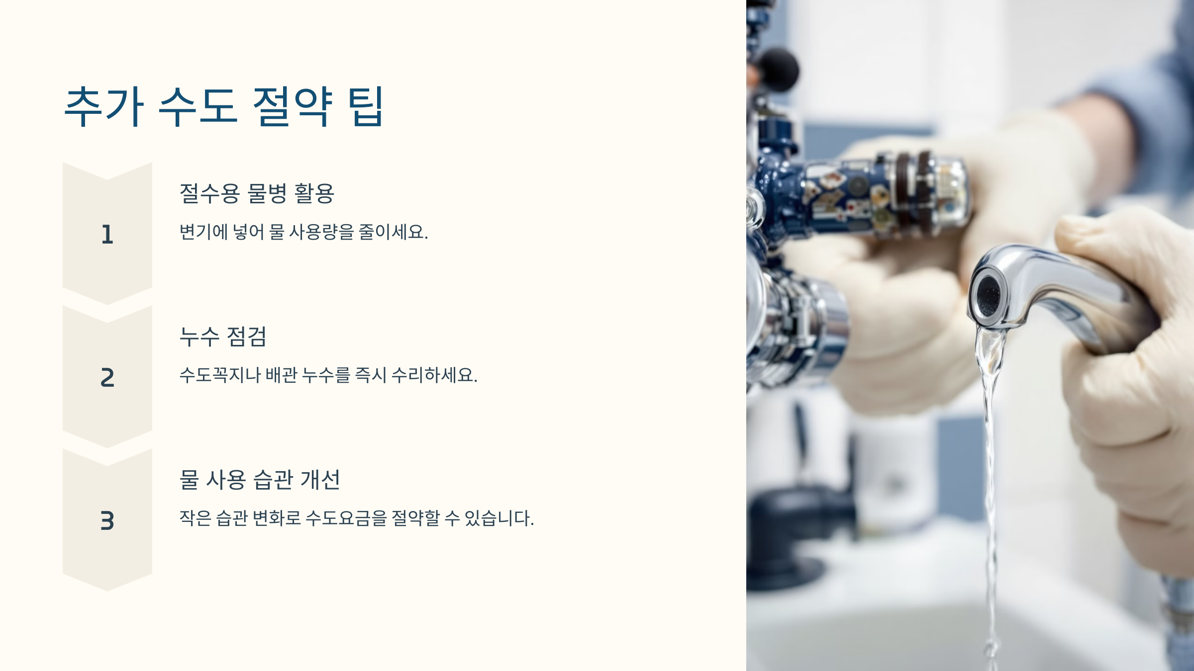다섯째, 수도꼭지나 배관 누수가 있다면 즉시 수리하세요. 누수는 요금 상승의 원인이 됩니다.
