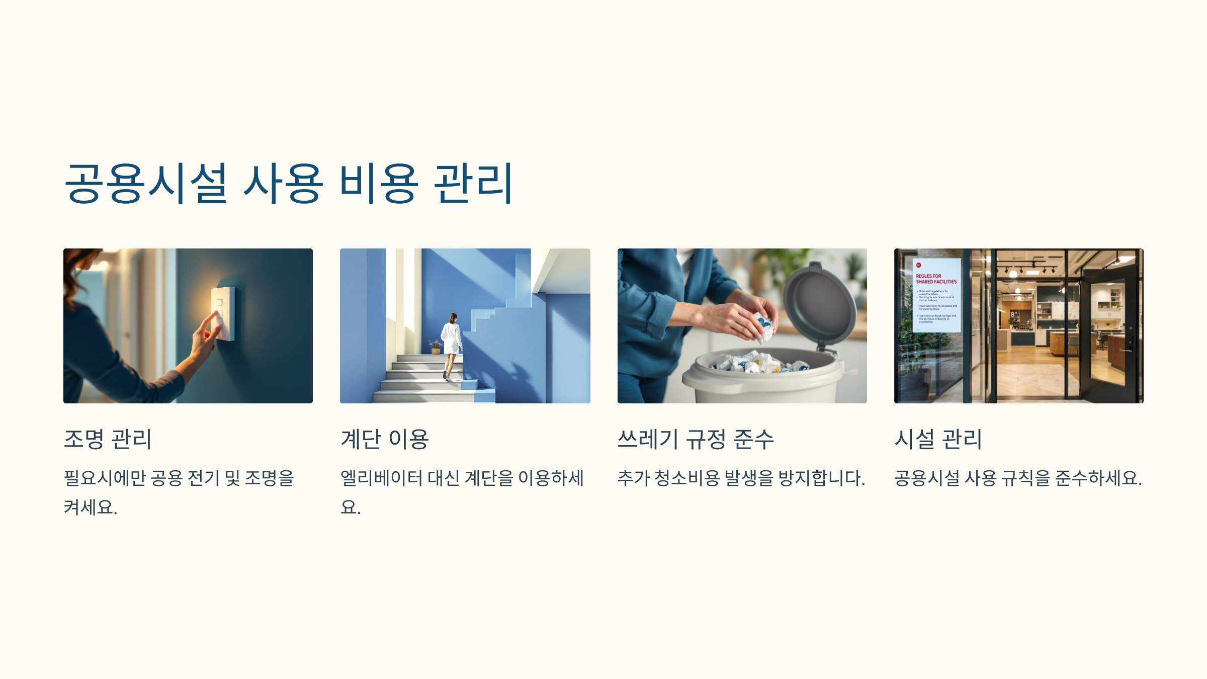 엘리베이터 대신 계단을 이용하거나 공용 조명을 절약적으로 사용하세요.
