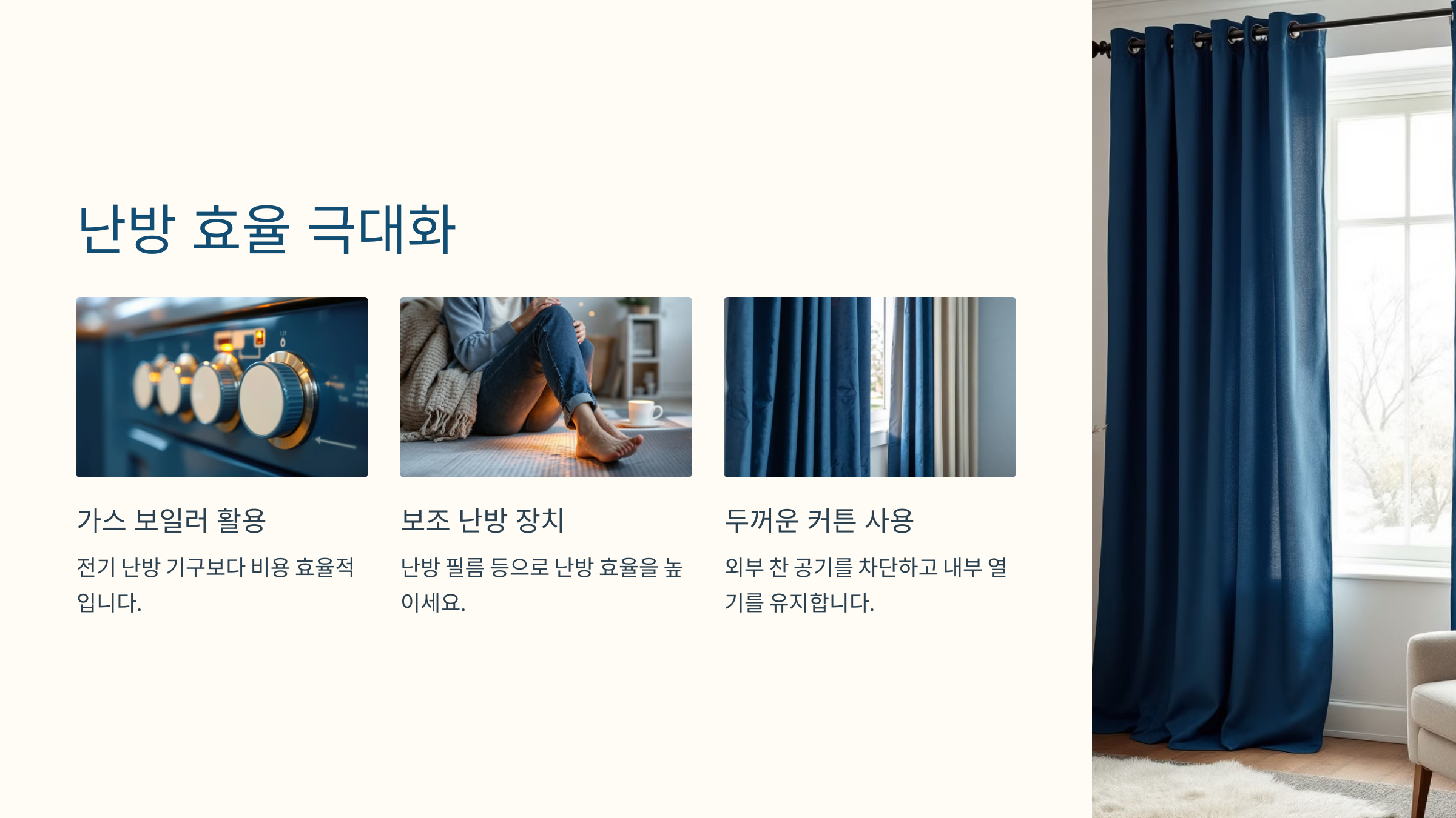 넷째, 두꺼운 커튼을 사용하여 외부 찬 공기가 들어오는 것을 막고 내부 열기를 유지할 수 있습니다.
