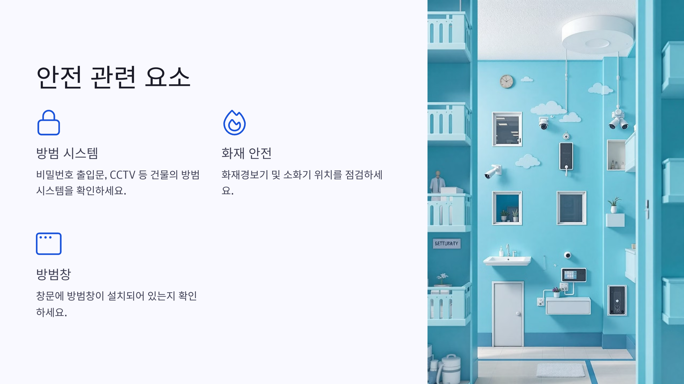 CCTV, 방범창, 화재경보기 등 안전 설비를 확인하고 출입구 조명을 체크하세요.