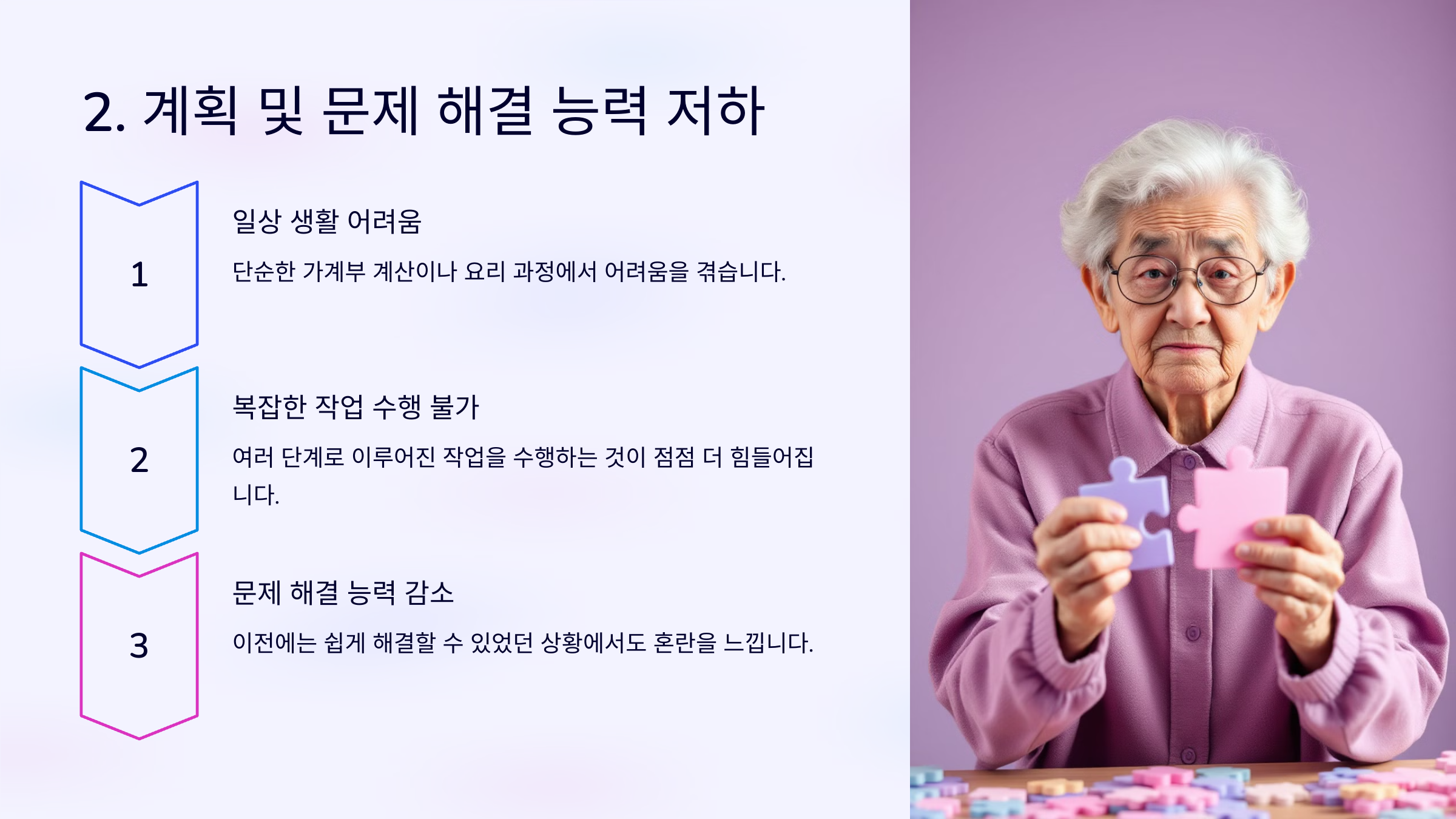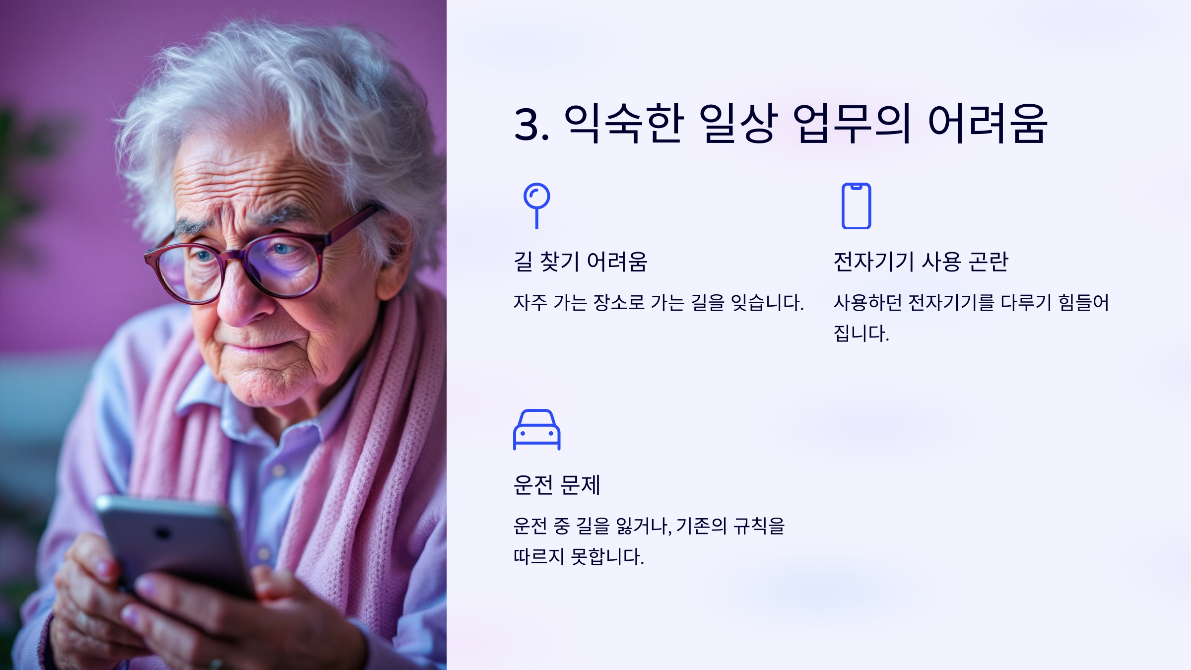 이러한 변화는 일상적인 문제 해결 능력을 방해하며 환자 자신과 주변 사람들에게 혼란을 초래합니다.