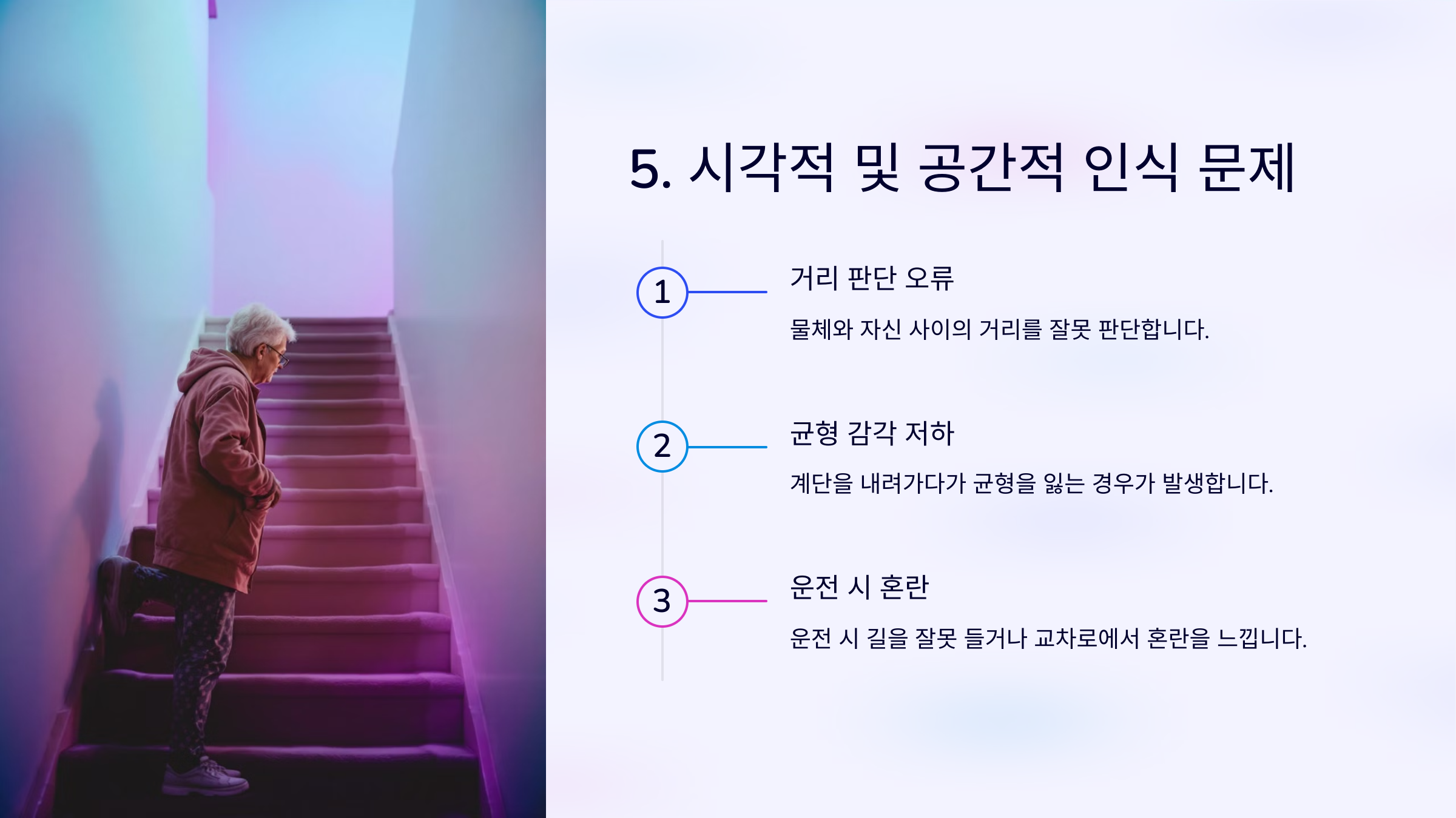 예를 들어, 물체와 자신 사이의 거리를 잘못 판단하거나 계단을 내려가다가 균형을 잃는 경우가 발생할 수 있습니다.
