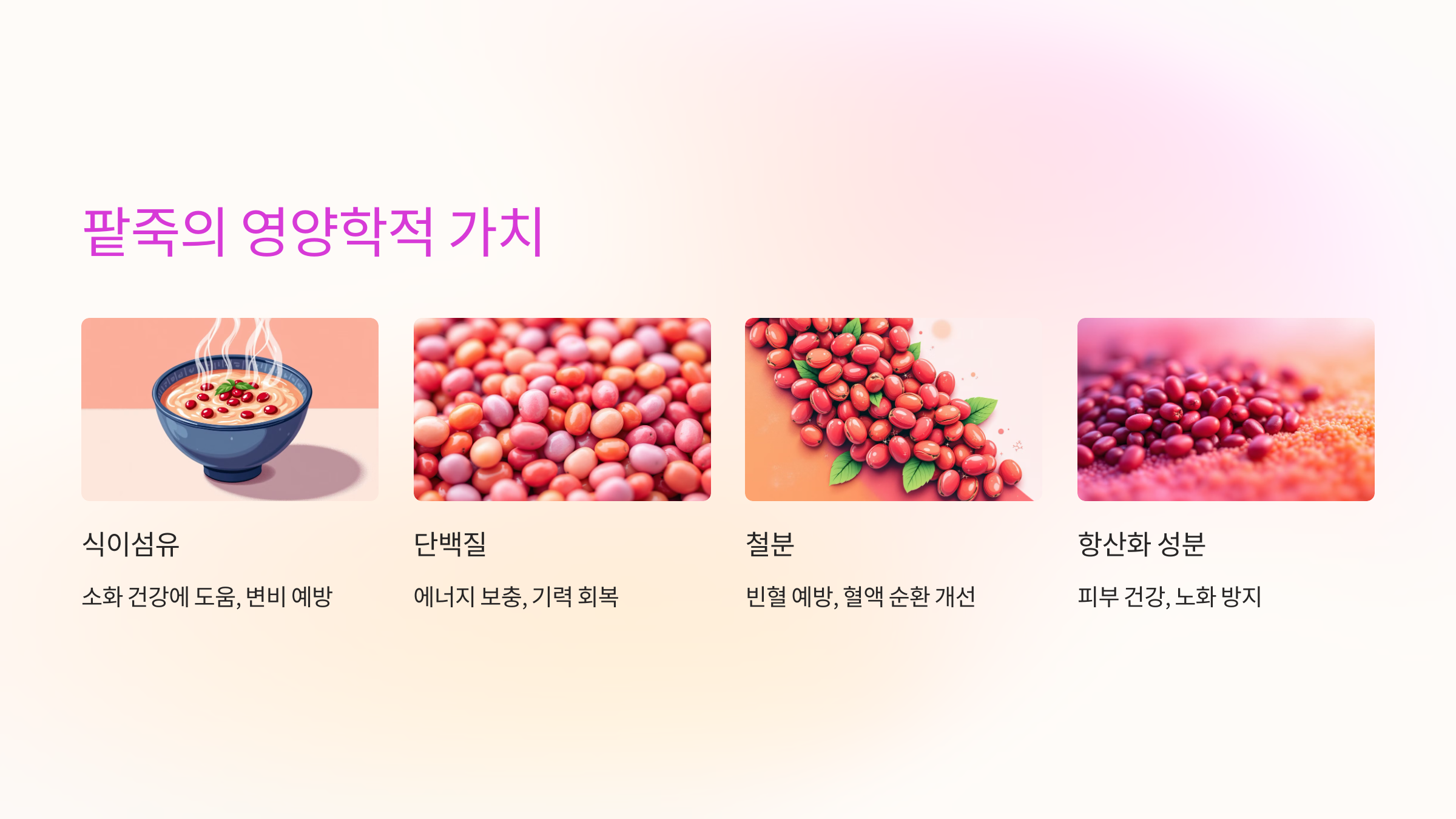 팥죽은 단순히 전통적인 음식으로서의 가치를 넘어 뛰어난 영양학적 특성을 지닌 건강 음식입니다. 팥의 주요 영양소와 효능을 알아봅시다.