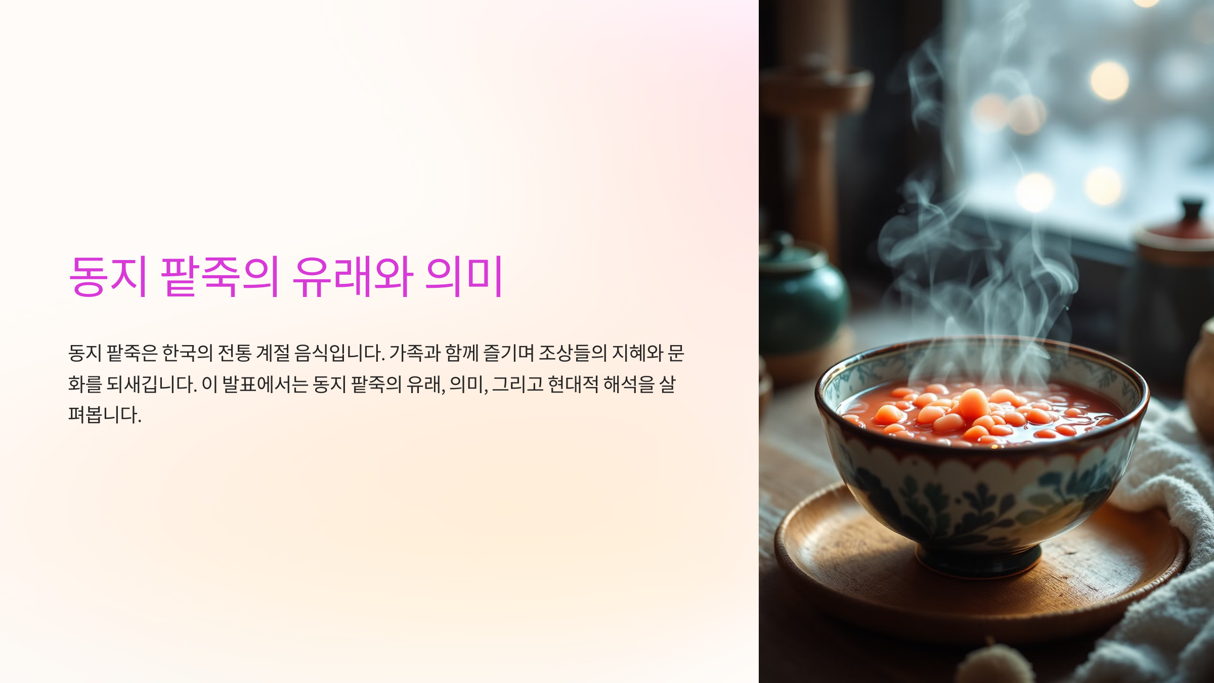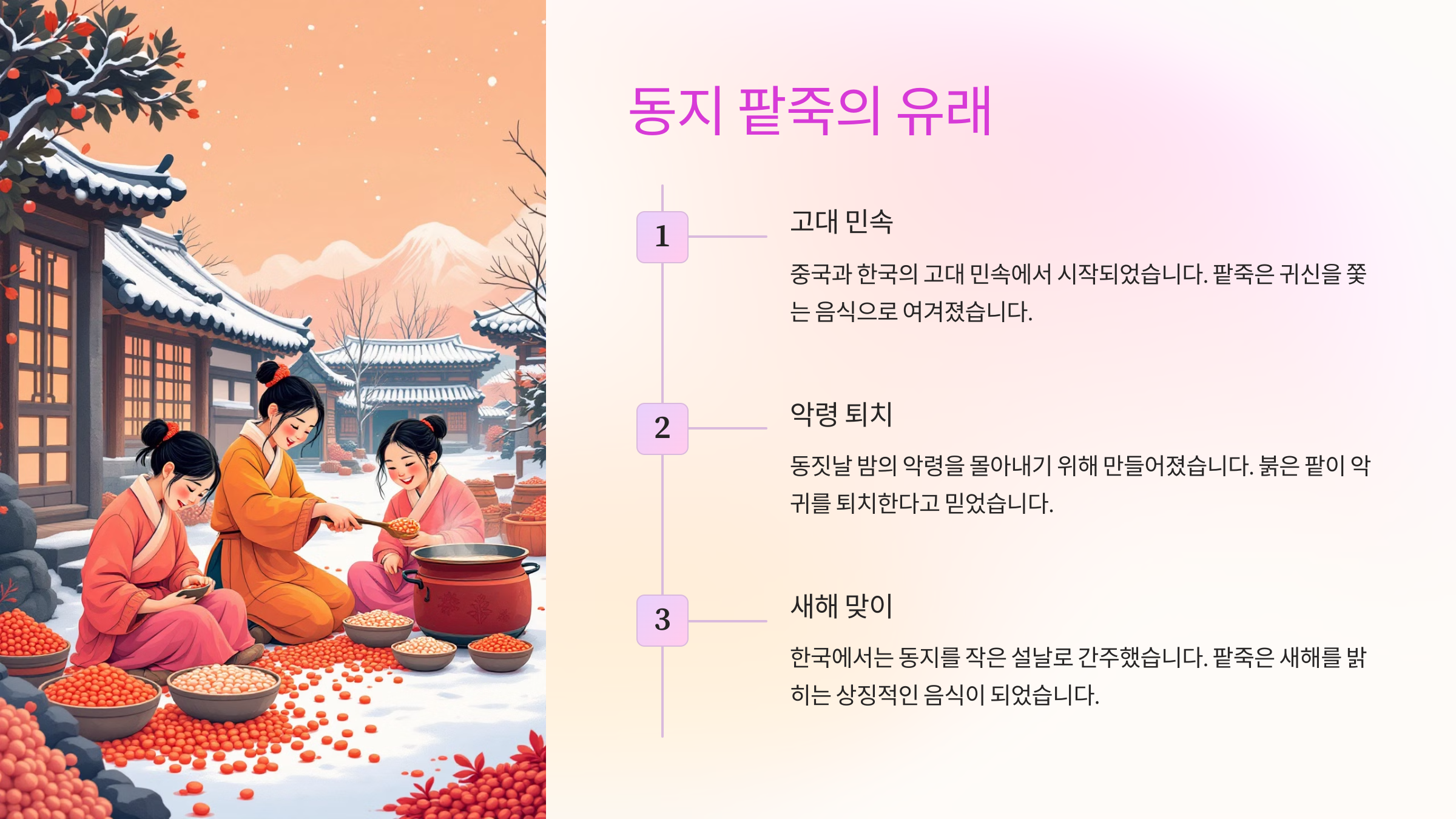 동지 팥죽의 유래는 단순한 음식의 이야기를 넘어 민족 문화와 자연에 대한 조상들의 지혜를 엿볼 수 있는 중요한 단서입니다.