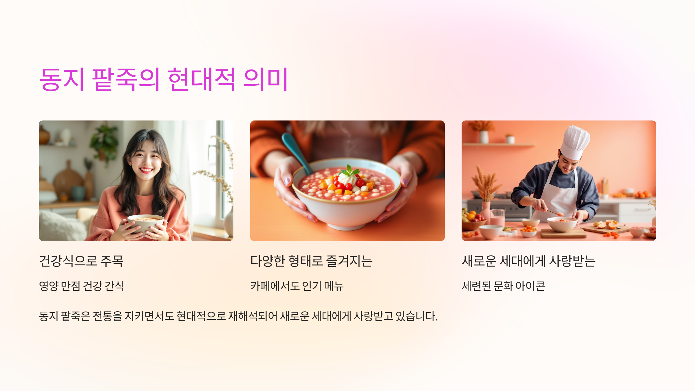 현대적으로 변형된 팥죽은 전통을 유지하면서도 새로운 맛과 경험을 선사하여, 더 많은 사람들에게 사랑받는 음식으로 자리 잡고 있습니다.