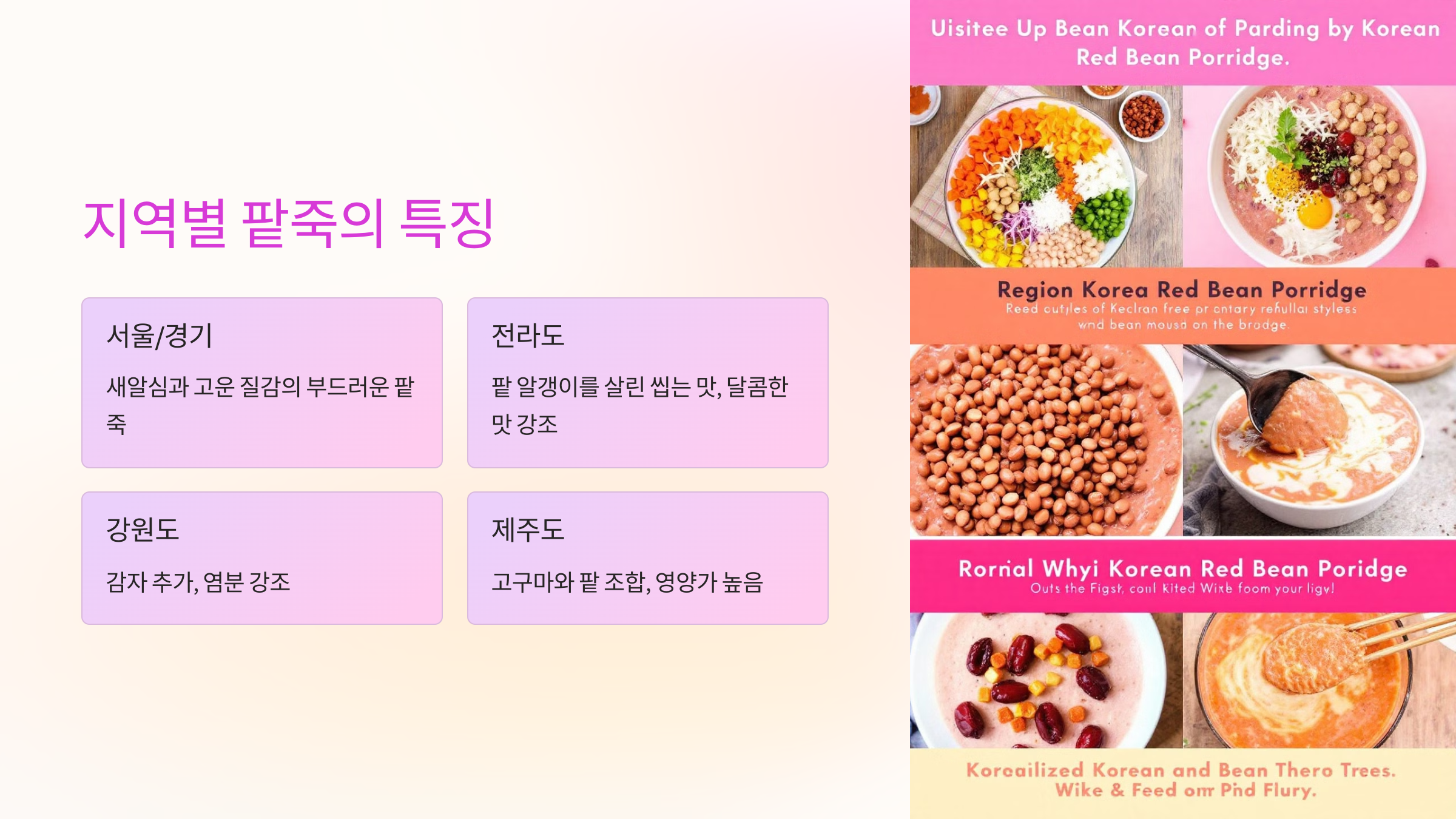 한국 각 지역에서는 전통 팥죽이 지역의 특색을 반영하여 다양한 형태로 발전해 왔습니다. 지역별 재료와 조리법의 차이를 살펴보는 것도 재미있습니다.
