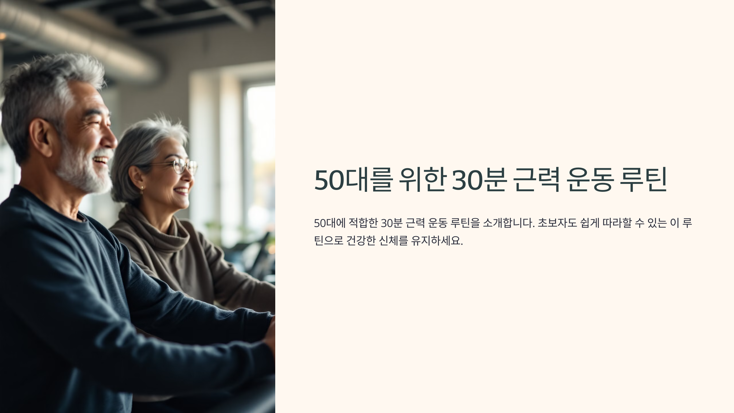 50대는 근육량 감소와 신체 기능 저하가 시작되는 시기이지만, 적절한 근력 운동을 통해 건강한 신체를 유지할 수 있습니다. 하루 30분만 투자하면 몸과 마음 모두 건강하게 가꿀 수 있는 근력 운동 루틴을 소개합니다. 이 루틴은 초보자도 쉽게 따라 할 수 있도록 설계되었습니다.