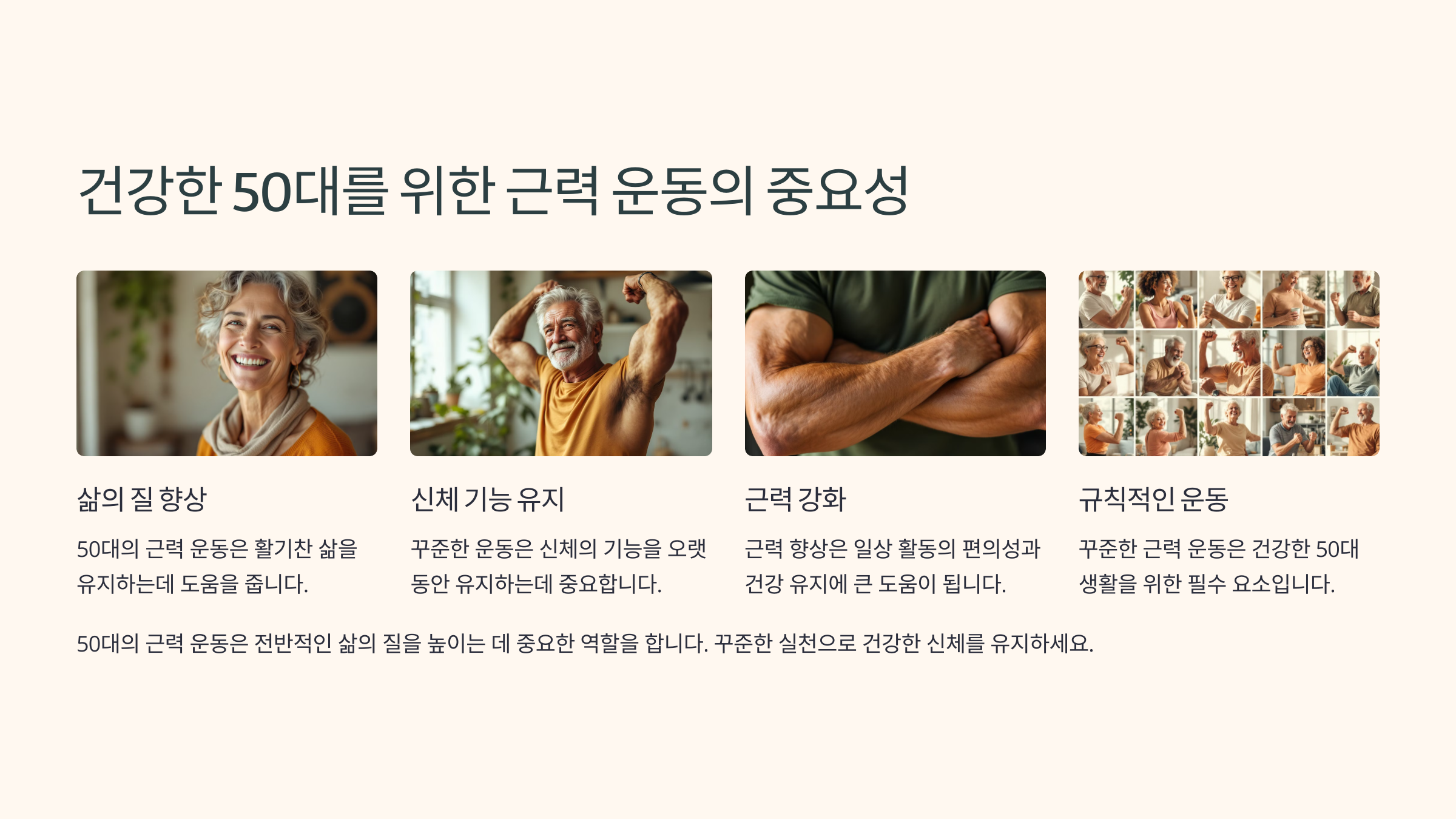 결론적으로, 근력 운동은 50대 이후의 전반적인 삶의 질을 높이는 데 중요한 역할을 합니다.
