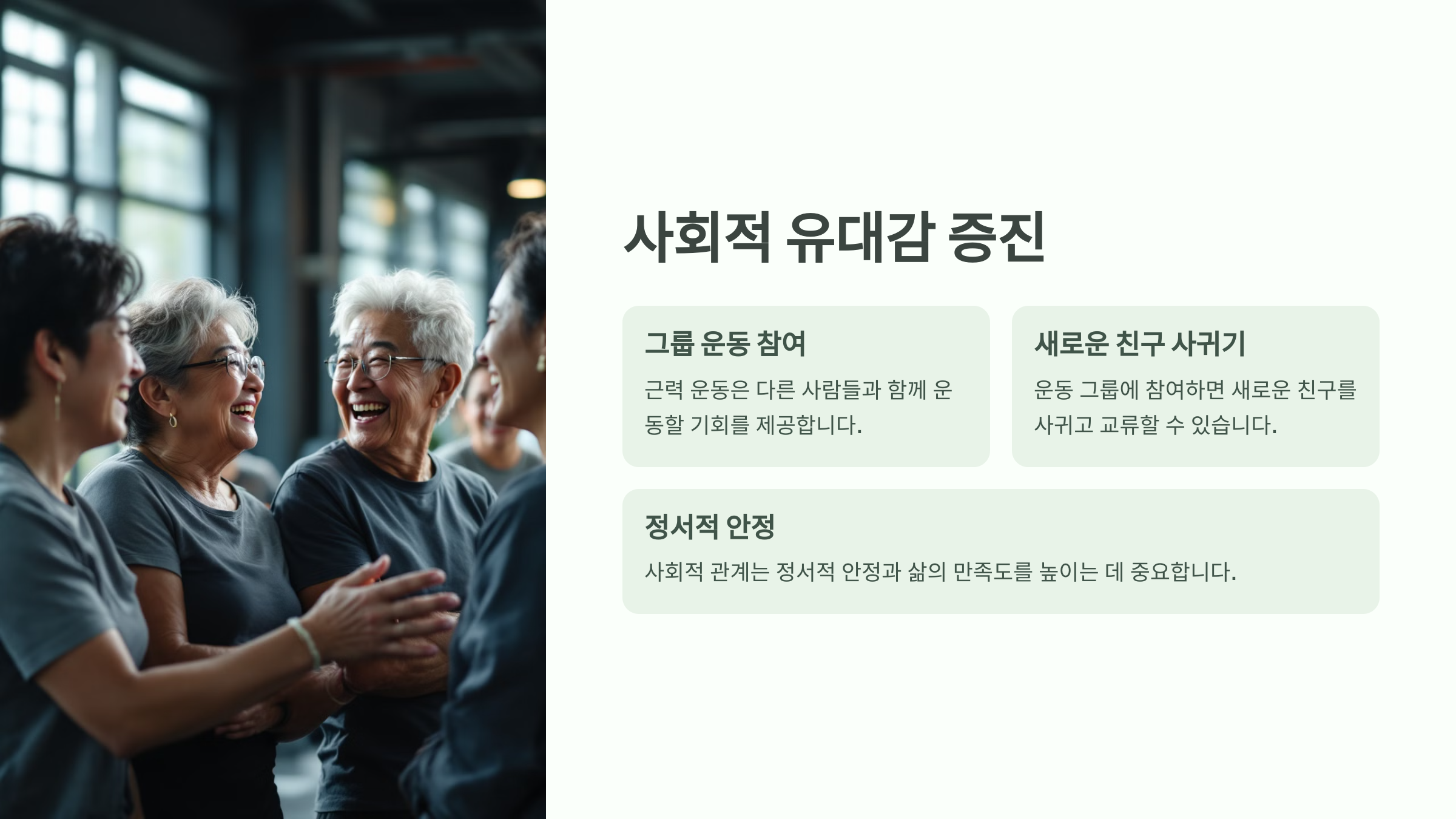 이제 근력 운동이 사회적 유대감에 미치는 영향을 알아보겠습니다.