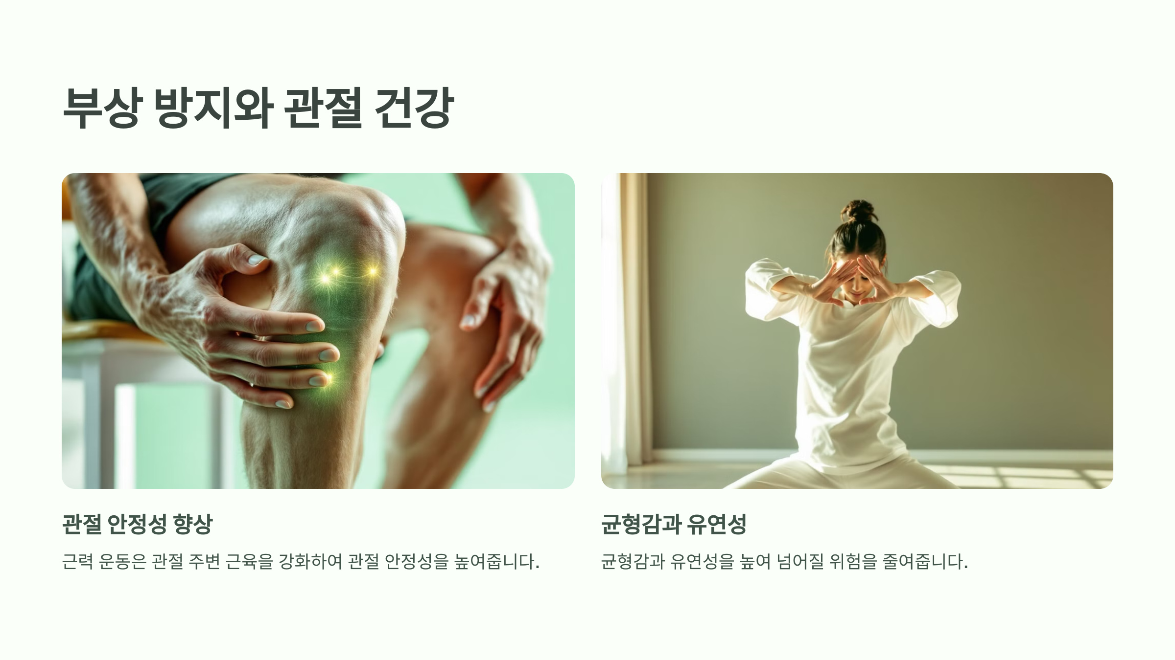 골절 예방 및 뼈 건강 증진을 위해 근력 운동은 필수적입니다.