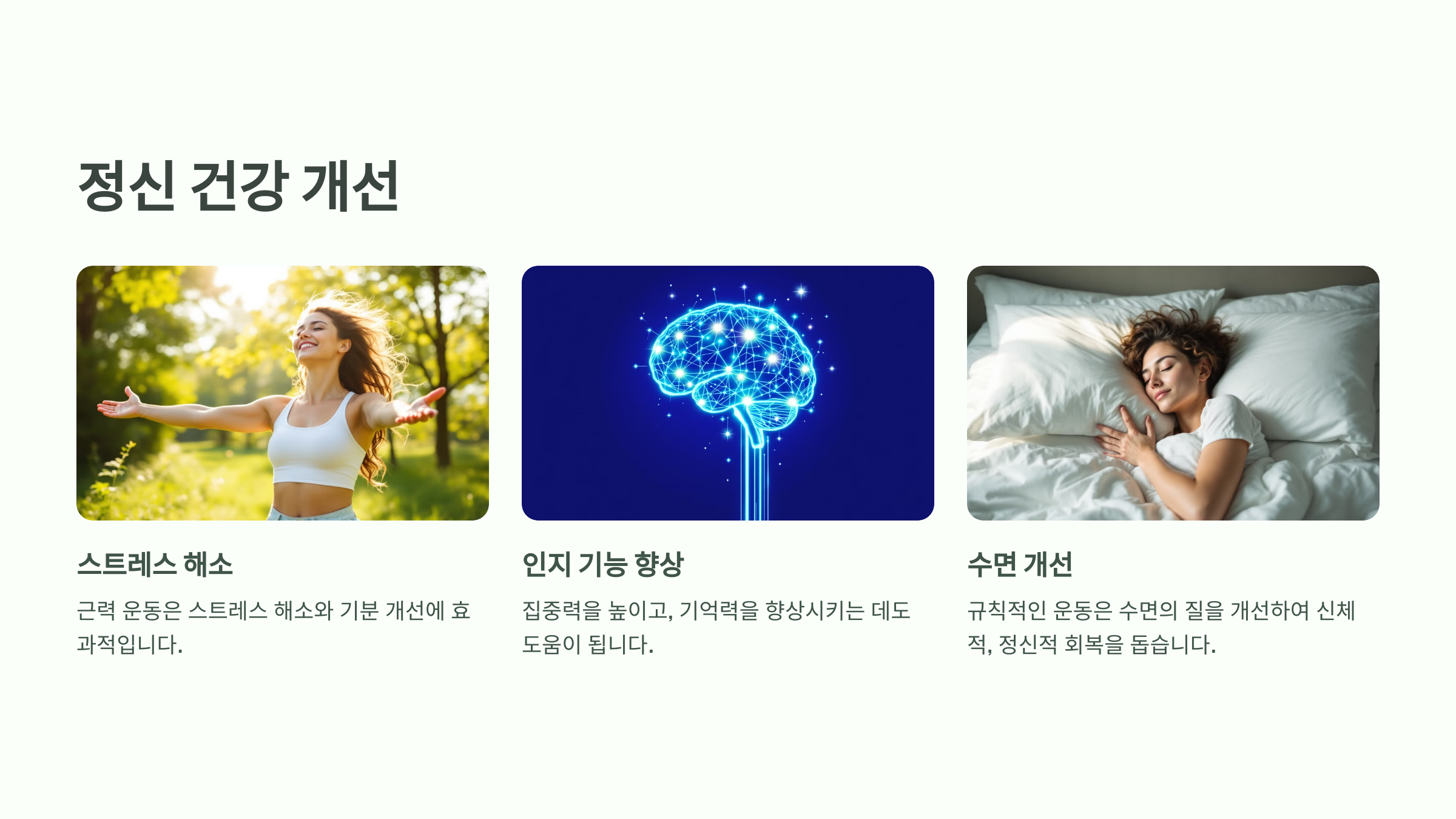 규칙적인 운동은 수면의 질을 개선하여 신체적, 정신적 회복을 돕습니다.