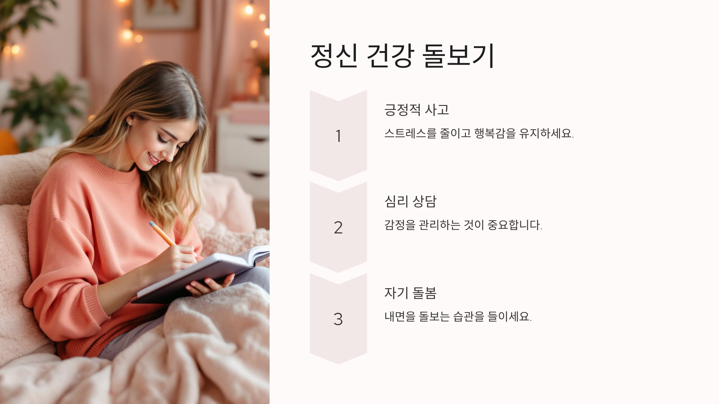 긍정적인 사고 방식을 통해 스트레스를 줄이고 행복감을 유지하세요.