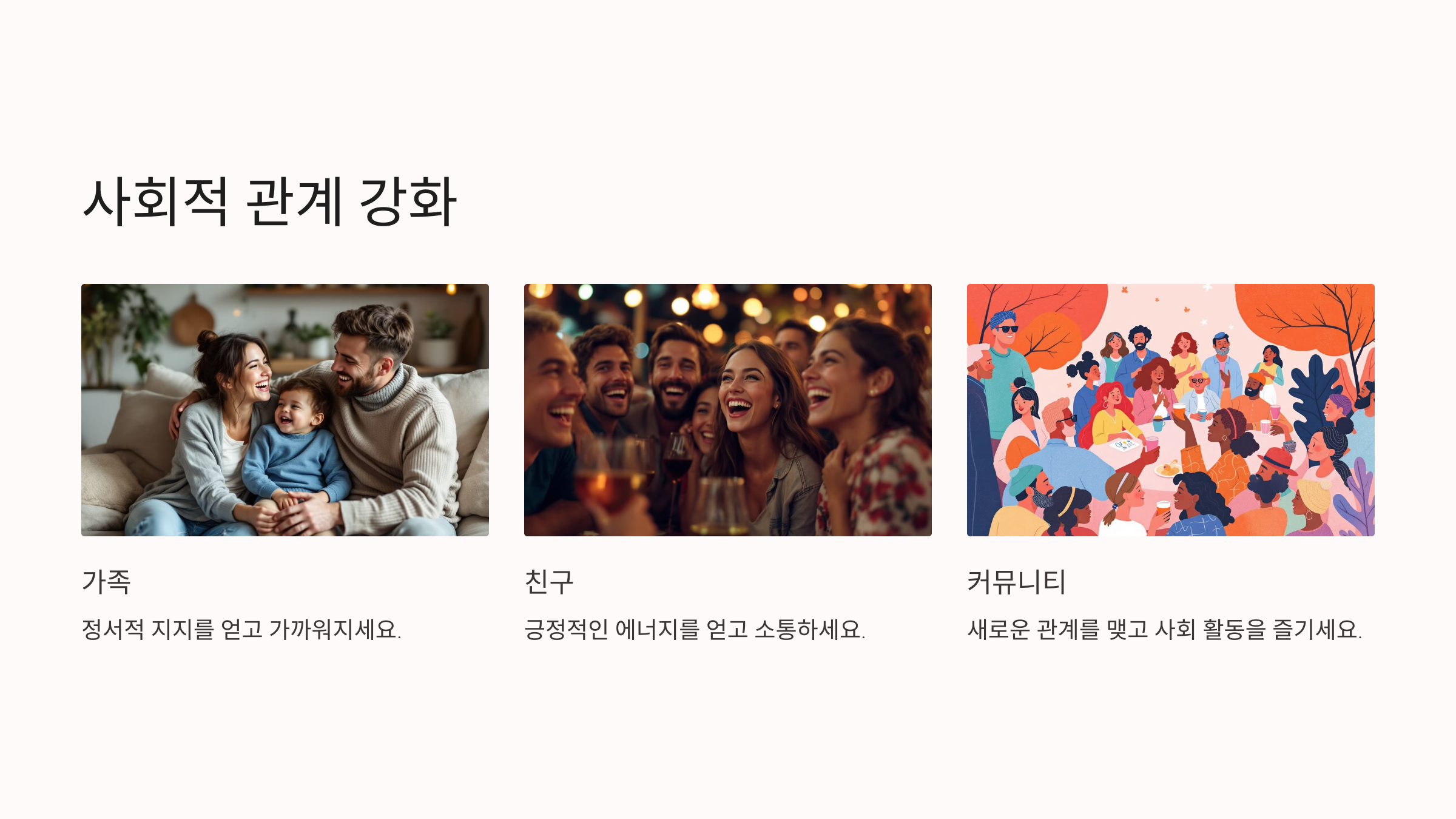 사회적 활동은 스트레스를 완화하고 행복감을 높여줍니다.