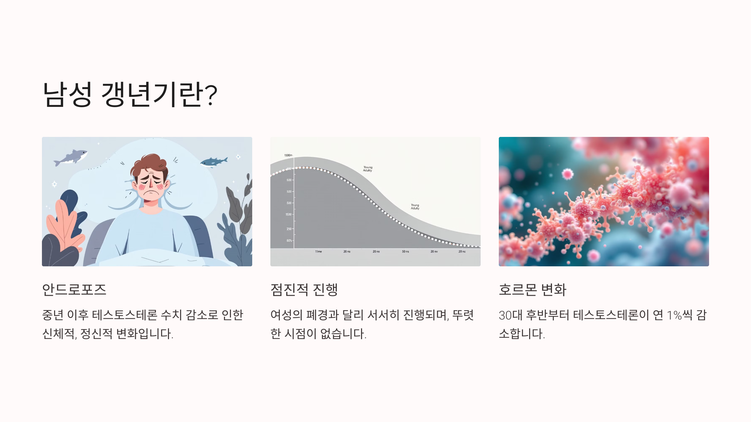 A: 보통 40대 후반에서 50대 초반에 시작되며, 테스토스테론 감소가 주요 원인입니다.
