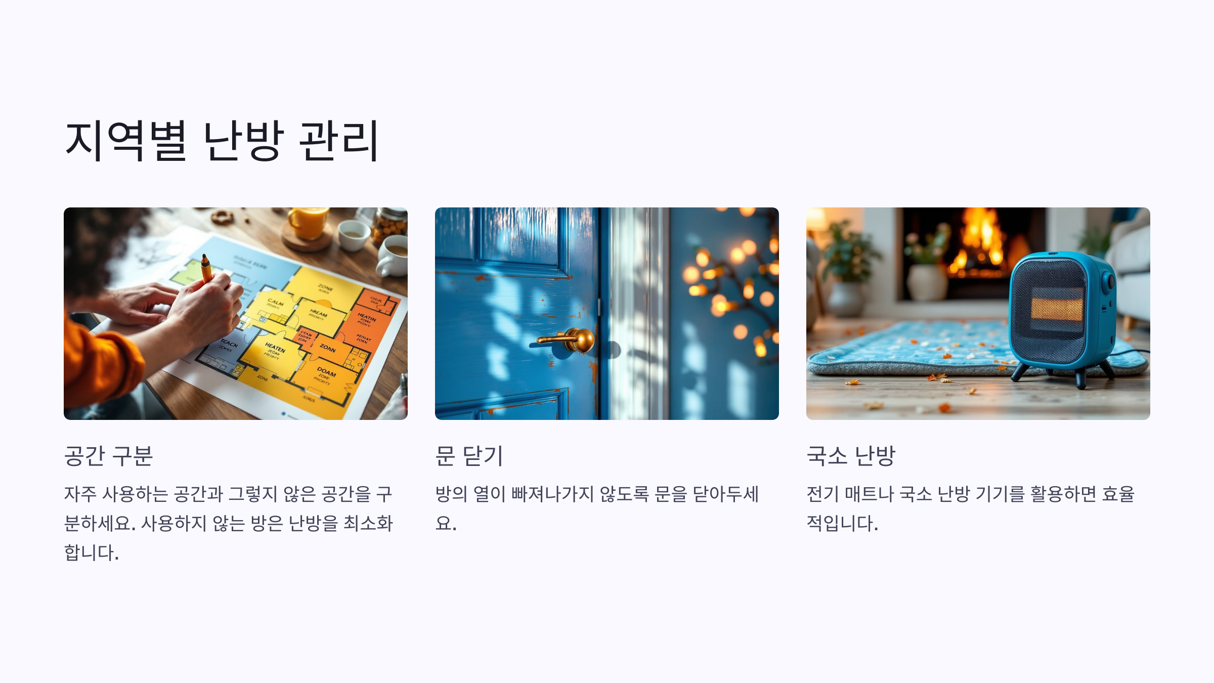 전기 매트나 국소 난방 기기를 활용하면 적은 에너지로도 효율적인 난방이 가능합니다.