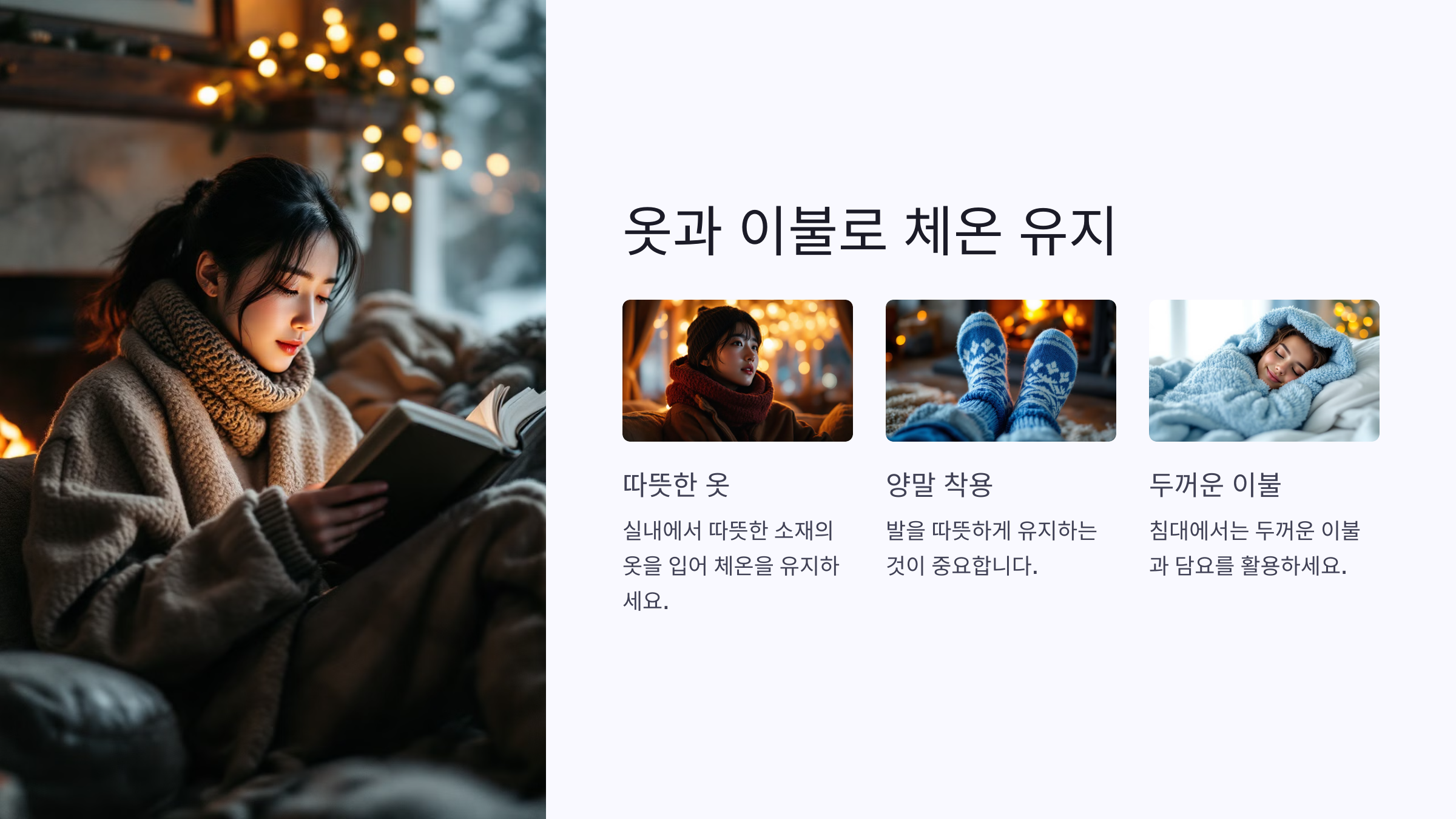 실내에서는 따뜻한 소재의 옷과 양말을 착용하여 몸의 열을 보존하세요.