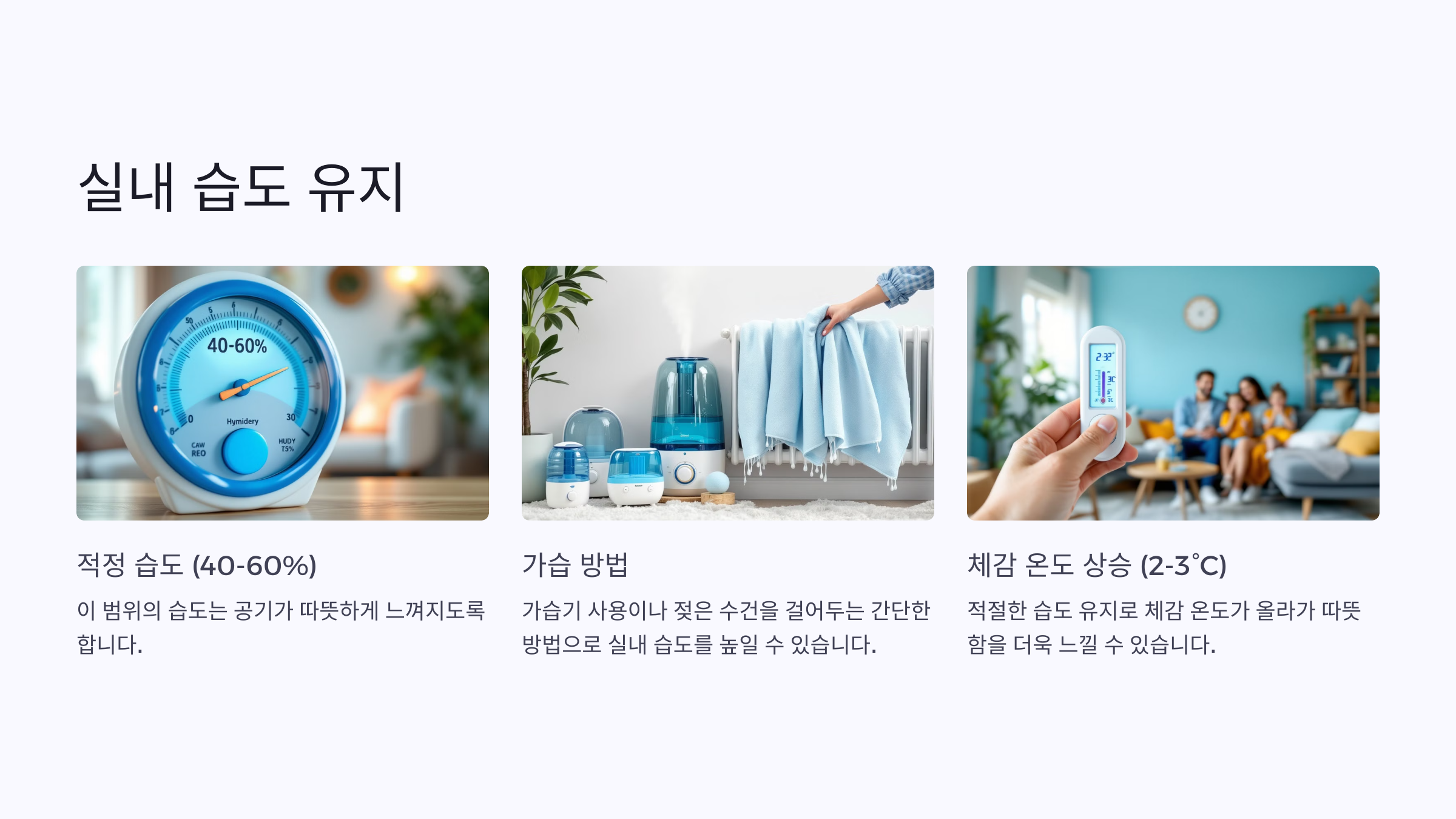 실내 습도를 40~60%로 유지하면 공기가 따뜻하게 느껴집니다.