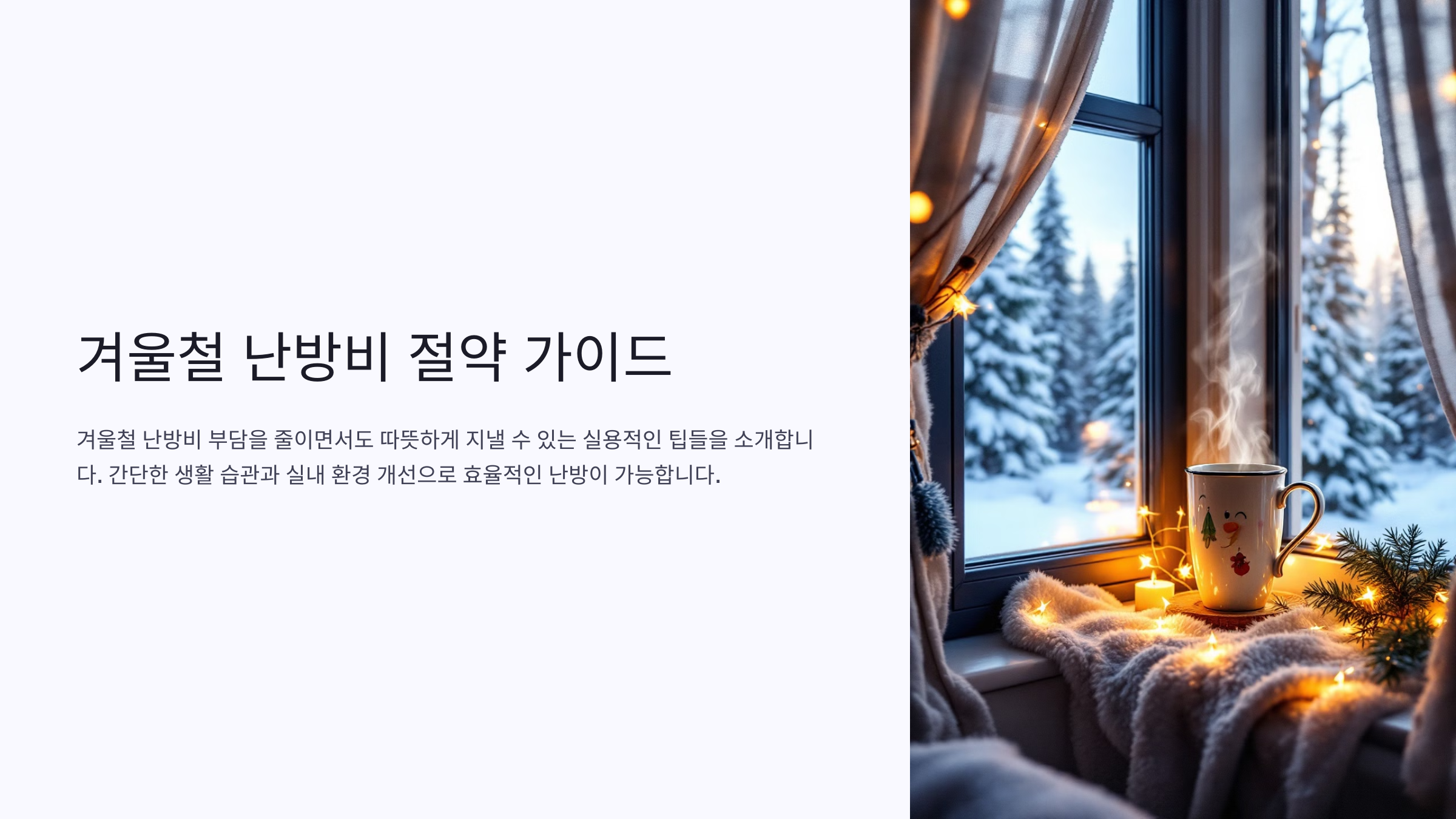 겨울철 난방비가 부담되는 계절이 돌아왔습니다. 하지만 간단한 생활 습관과 실내 환경 개선을 통해 난방비를 효과적으로 줄이면서도 따뜻하게 겨울을 보낼 수 있습니다. 이번 글에서는 한파에도 효율적으로 집을 따뜻하게 유지할 수 있는 실용적인 꿀팁들을 소개합니다.