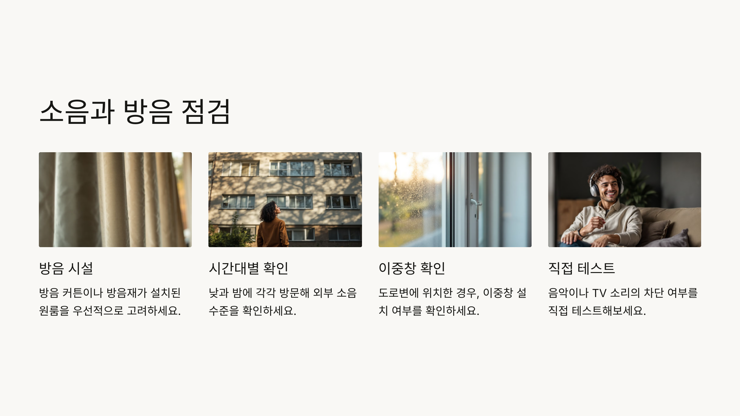 창문과 문 틈새로 소음이 들어오는지 확인하고 개선 가능 여부를 물어보세요.