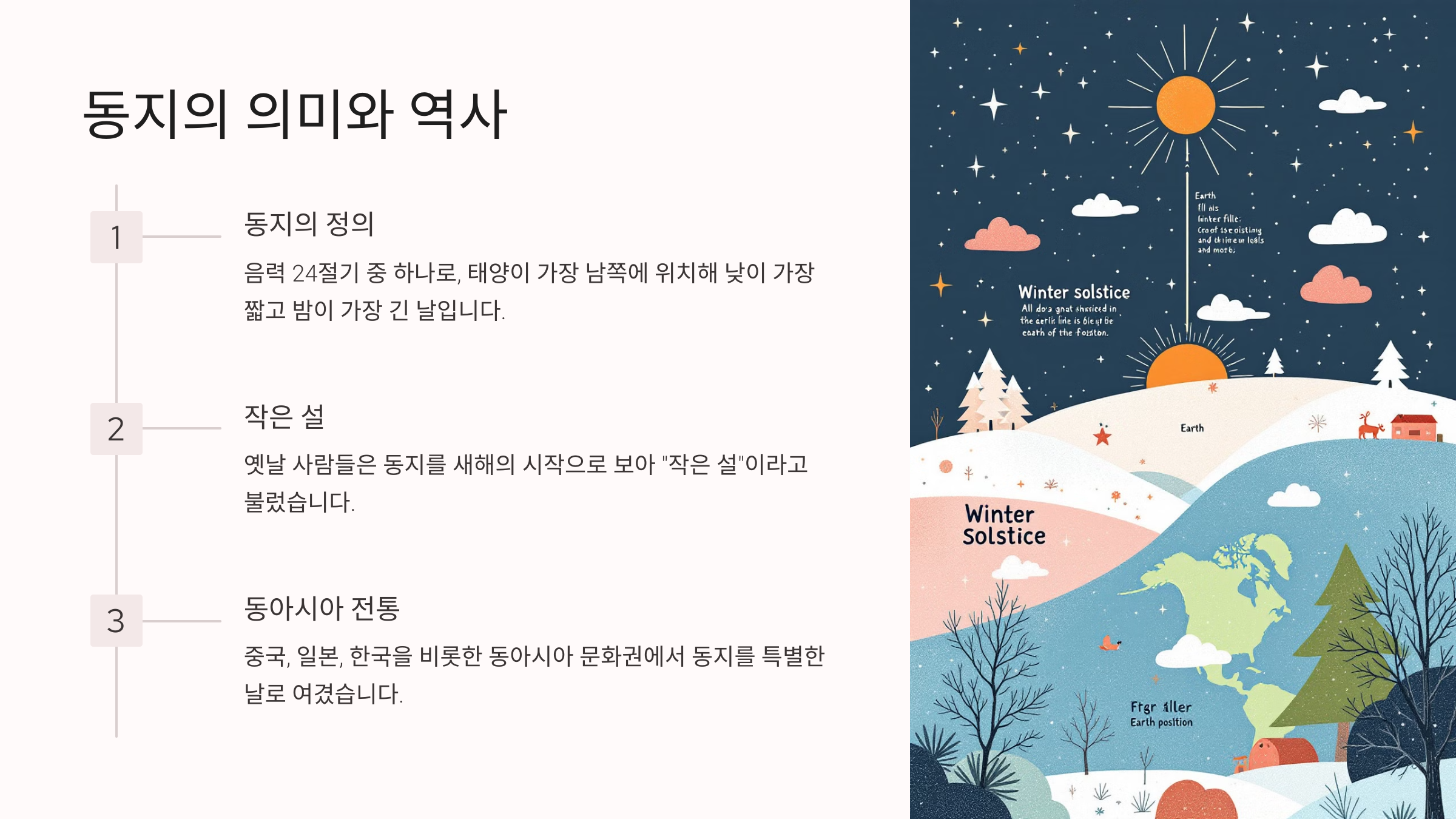 동지는 과학적으로는 동지점(冬至點)이라 하여 천문학적으로도 중요한 의미를 가집니다.