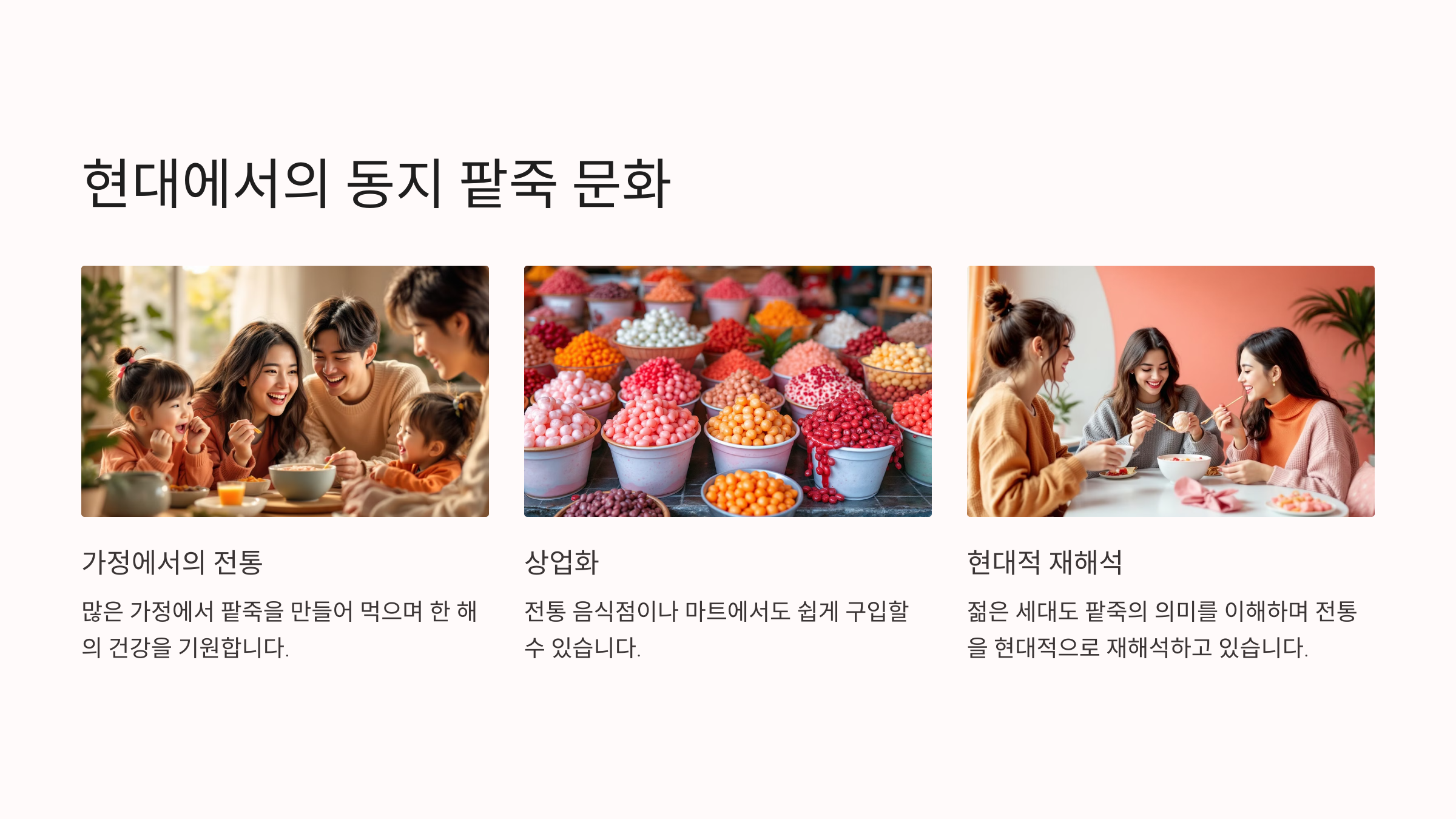 현대에서도 동지 팥죽은 전통을 이어가는 중요한 음식으로 자리 잡고 있습니다.
