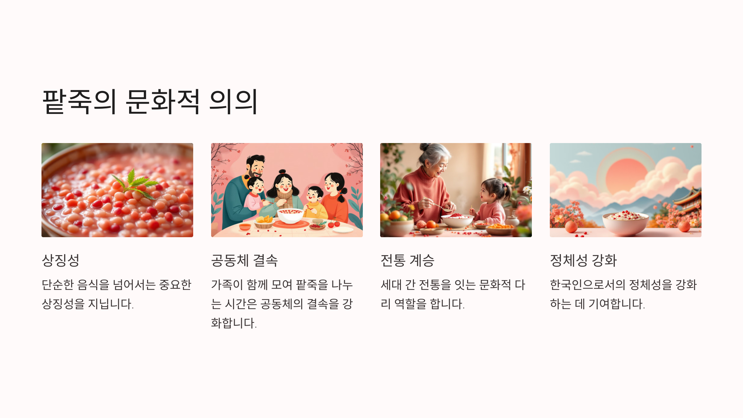 팥죽은 단순히 먹는 음식을 넘어서는 중요한 상징성을 지닙니다.