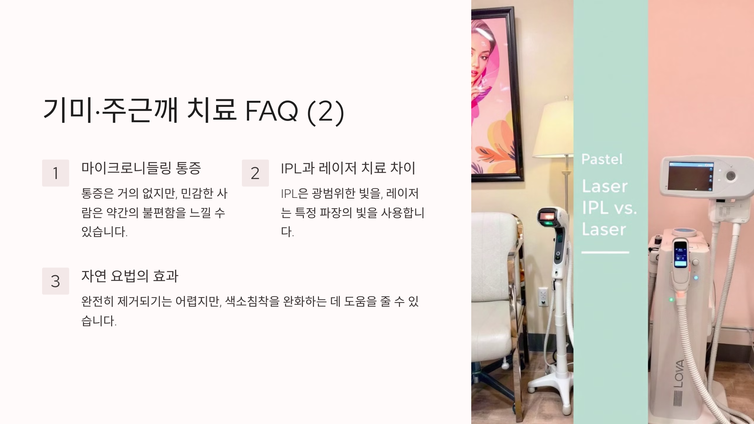 레이저 치료에 비해 통증이 적고 회복 시간이 짧습니다.