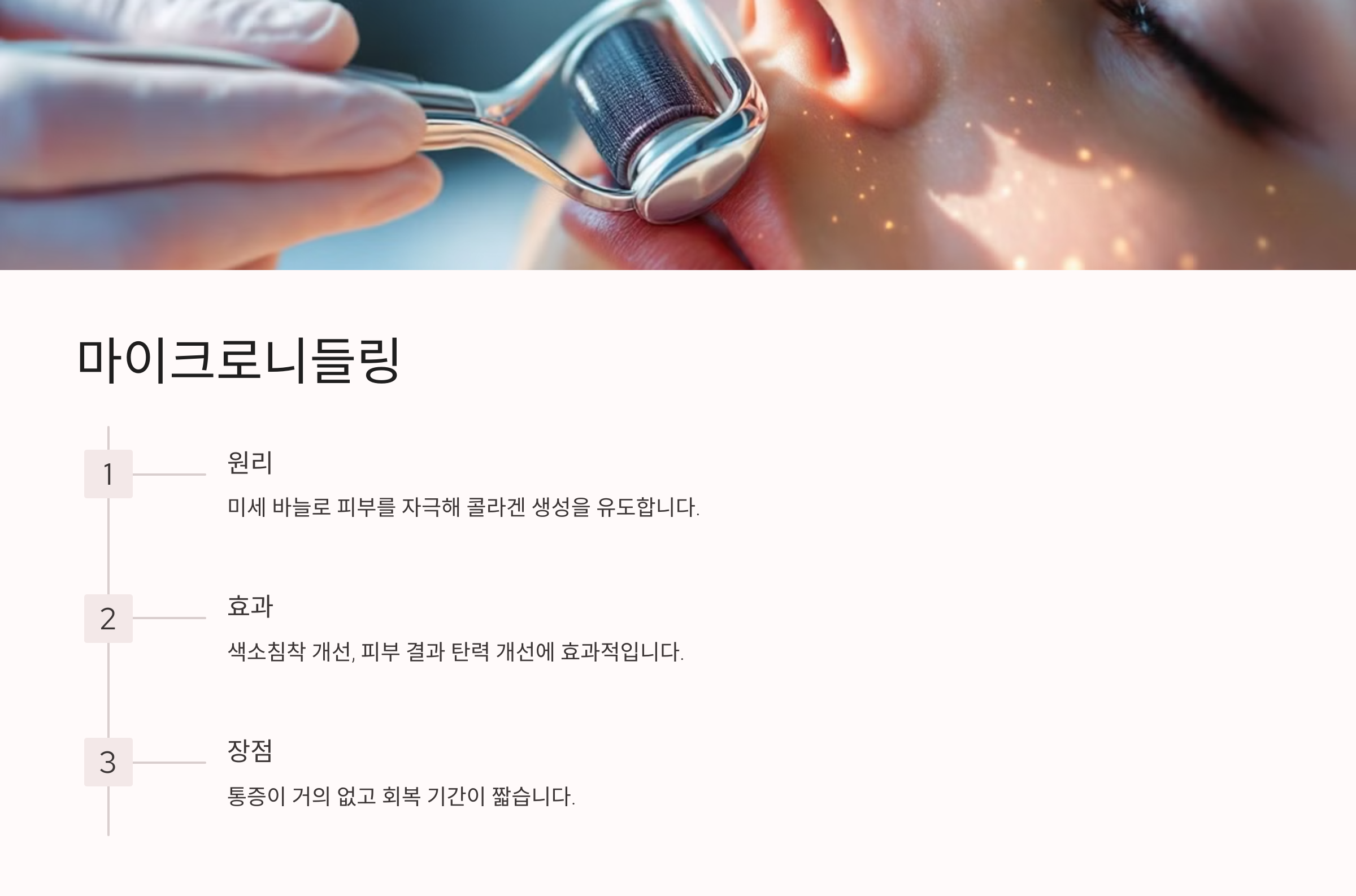 마이크로니들링은 미세 바늘로 피부를 자극해 콜라겐 생성을 유도하는 시술입니다.
