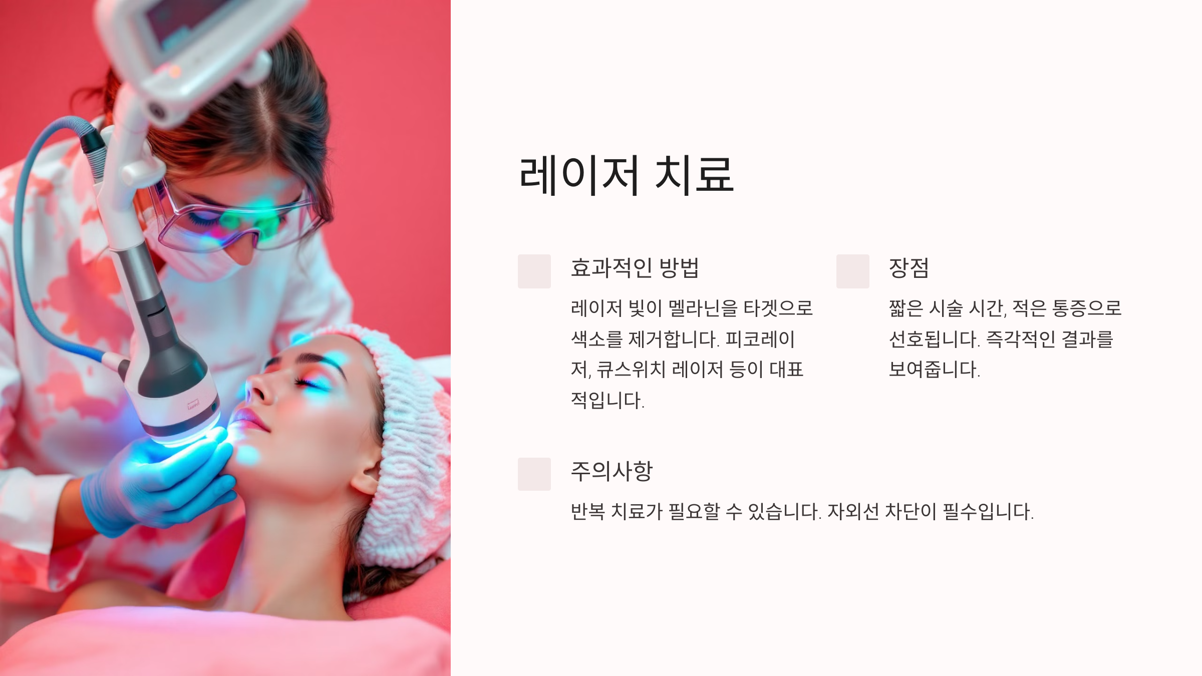 레이저 치료는 즉각적인 결과를 보여주지만, 몇 차례 반복 치료가 필요할 수 있습니다.