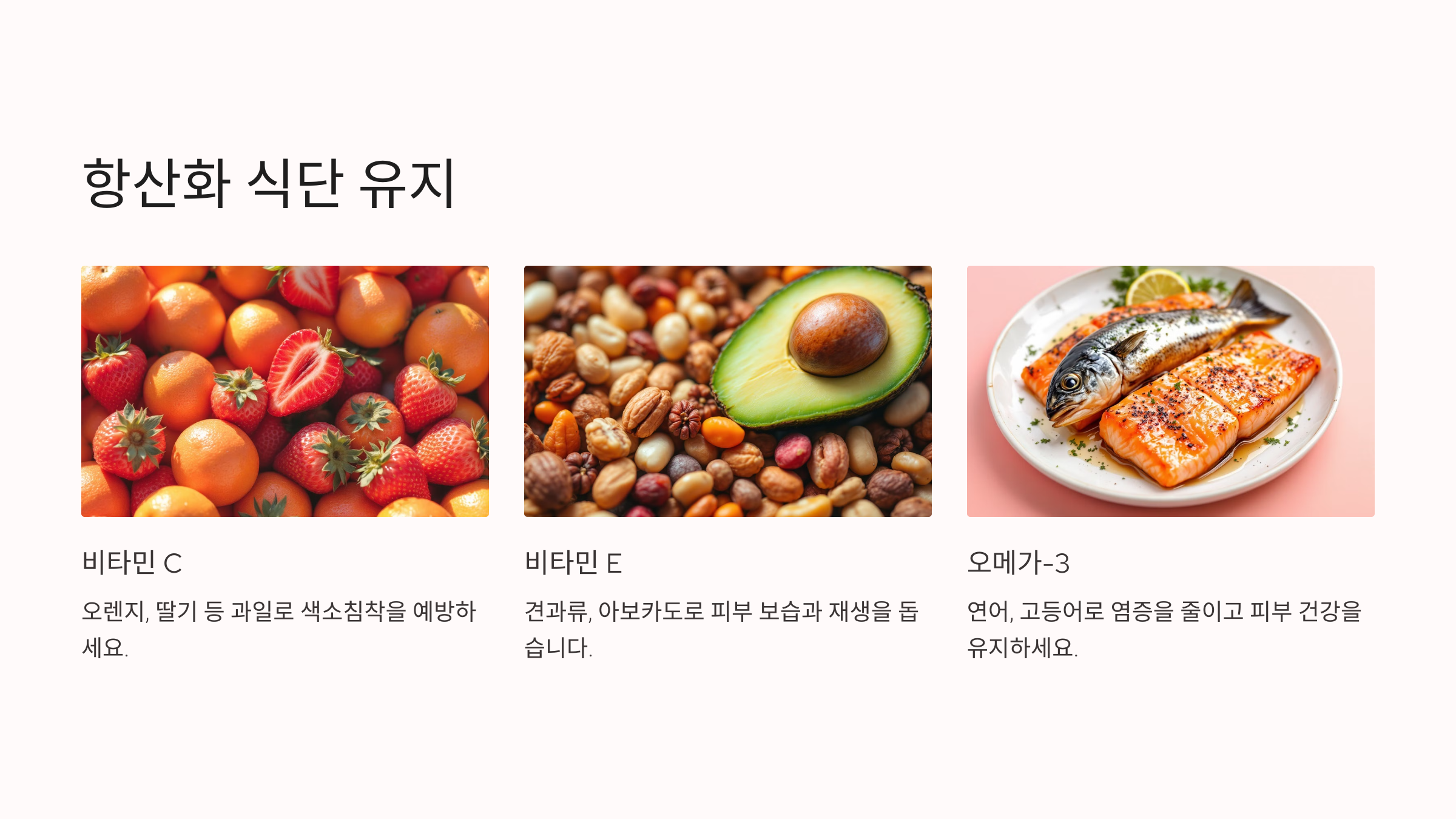 오메가-3 지방산이 풍부한 생선(예: 연어, 고등어)은 염증을 줄이고 피부 건강을 유지합니다.